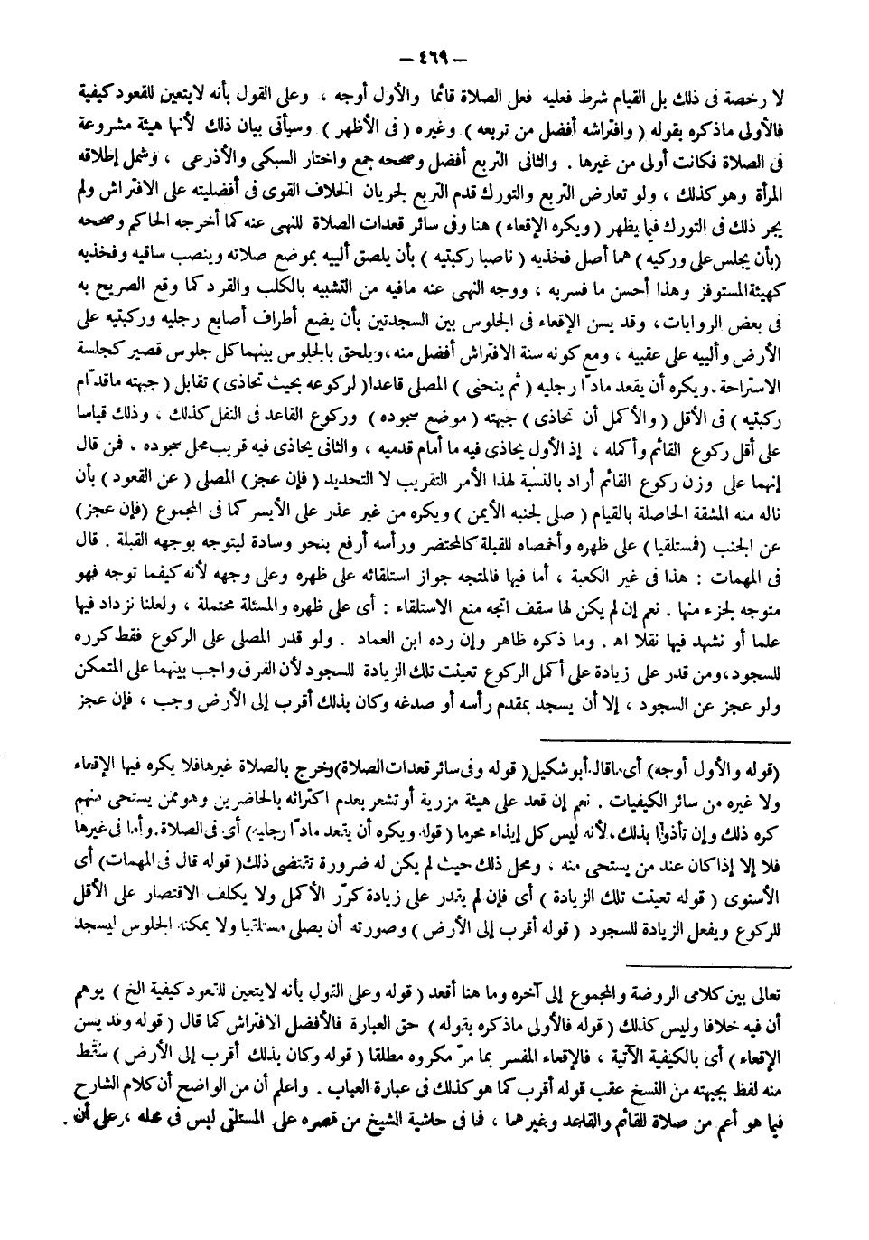 نَعَمْ إنْ قَعَدَ عَلَى هَيْئَةٍ مُزْرِيَةٍ أَوْ تُشْعِرُ بِعَدَمِ اكْتِرَاثِهِ بِالْحَاضِرِينَ وَهُوَ مِمَّنْ يُسْتَحَى مِنْهُمْ كُرِهَ ذَلِكَ وَإِنْ تَأَذَّوْا بِذَلِكَ، لِأَنَّهُ لَيْسَ كُلُّ إيذَاءٍ مُحَرَّمًا (قَوْلُهُ: وَيُكْرَهُ أَنْ يَعْقِدَ مَادًّا رِجْلَيْهِ) أَيْ فِي الصَّلَاةِ وَأَمَّا فِي غَيْرِهَا فَلَا إلَّا إذَا كَانَ عِنْدَ مَنْ يَسْتَحْيِ مِنْهُ، وَمَحَلُّ ذَلِكَ حَيْثُ لَمْ يَكُنْ لَهُ ضَرُورَةٌ تَقْتَضِي ذَلِكَ (قَوْلُهُ: قَالَ فِي الْمُهِمَّاتِ) أَيْ الْإِسْنَوِيُّ (قَوْلُهُ: تَعَيَّنَتْ تِلْكَ الزِّيَادَةُ) أَيْ فَإِنْ لَمْ يَقْدِرْ عَلَى زِيَادَةٍ كَرَّرَ الْأَكْمَلَ وَلَا يُكَلَّفُ الِاقْتِصَارَ عَلَى الْأَقَلِّ لِلرُّكُوعِ وَيَفْعَلُ الزِّيَادَةَ لِلسُّجُودِ (قَوْلُهُ: أَقْرَبَ إلَى الْأَرْضِ) وَصُورَتُهُ أَنْ يُصَلِّيَ مُسْتَلْقِيًا وَلَا يُمْكِنُهُ الْجُلُوسُ لِيَسْجُدَ