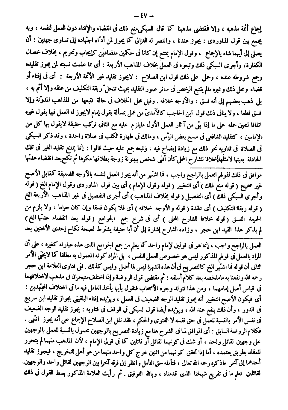 ـــــــــــــــــــــــــــــQالْعَمَلُ بِالرَّاجِحِ وَاجِبٌ، إنَّمَا هُوَ فِي قَوْلَيْنِ لِإِمَامٍ وَاحِدٍ كَمَا يُعْلَمُ مِنْ جَمْعِ الْجَوَامِعِ الَّذِي هَذِهِ عِبَارَتُهُ كَغَيْرِهِ، عَلَى أَنَّ الْمُرَادَ بِالْعَمَلِ فِي قَوْلِهِ الْمَذْكُورِ لَيْسَ هُوَ خُصُوصُ الْعَمَلِ لِلنَّفْسِ، بَلْ الْمُرَادُ كَوْنُهُ الْمَعْمُولُ بِهِ مُطْلَقًا كَمَا لَا يَخْفَى الْأَمْرُ الثَّانِي أَنَّ قَوْلَهُ فَمَا اُشْتُهِرَ إلَخْ كَالتَّصْرِيحِ فِي أَنَّ هَذِهِ الشُّهْرَةَ لَيْسَ لَهَا أَصْلٌ وَلَيْسَ كَذَلِكَ.