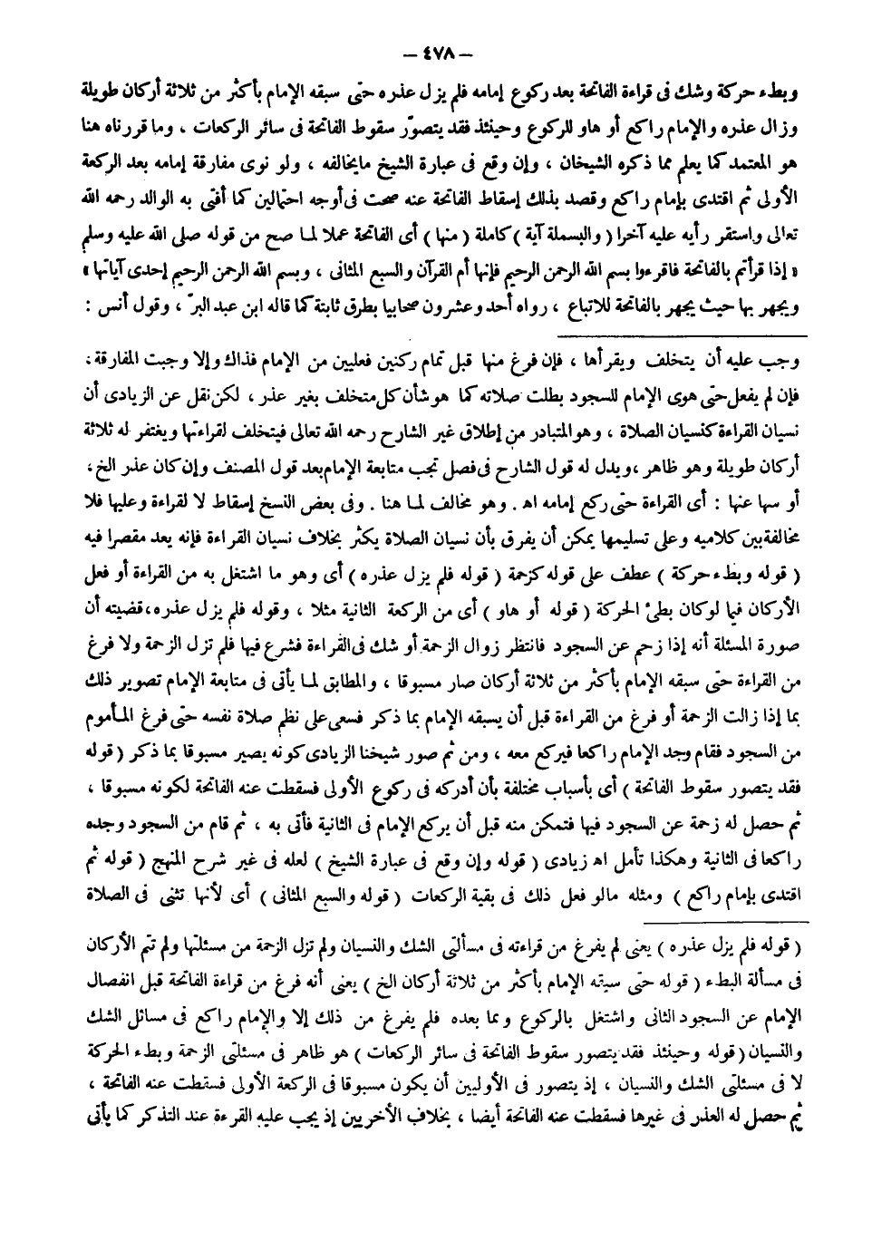 وَبُطْءِ حَرَكَةٍ وَشَكٍّ فِي قِرَاءَةِ الْفَاتِحَةِ بَعْدَ رُكُوعِ إمَامِهِ فَلَمْ يَزُلْ عُذْرُهُ حَتَّى سَبَقَهُ الْإِمَامُ بِأَكْثَرَ مِنْ ثَلَاثَةِ أَرْكَانٍ طَوِيلَةٍ وَزَالَ عُذْرُهُ وَالْإِمَامُ رَاكِعٌ أَوْ هَاوٍ لِلرُّكُوعِ وَحِينَئِذٍ فَقَدْ يُتَصَوَّرُ سُقُوطُ الْفَاتِحَةِ فِي سَائِرِ الرَّكَعَاتِ، وَمَا قَرَرْنَاهُ هُنَا هُوَ الْمُعْتَمَدُ كَمَا يُعْلَمُ مِمَّا ذَكَرَهُ الشَّيْخَانِ، وَإِنْ وَقَعَ فِي عِبَارَةِ الشَّيْخِ مَا يُخَالِفُهُ، وَلَوْ نَوَى مُفَارَقَةَ إمَامِهِ بَعْدَ الرَّكْعَةِ الْأُولَى ثُمَّ اقْتَدَى بِإِمَامٍ رَاكِعٍ وَقَصَدَ بِذَلِكَ إسْقَاطَ الْفَاتِحَةِ عَنْهُ صَحَّتْ فِي أَوْجُهٍ احْتِمَالَيْنِ كَمَا أَفْتَى بِهِ الْوَالِدُ - رَحِمَهُ اللَّهُ تَعَالَى - وَاسْتَقَرَّ رَأْيُهُ عَلَيْهِ آخِرًا.