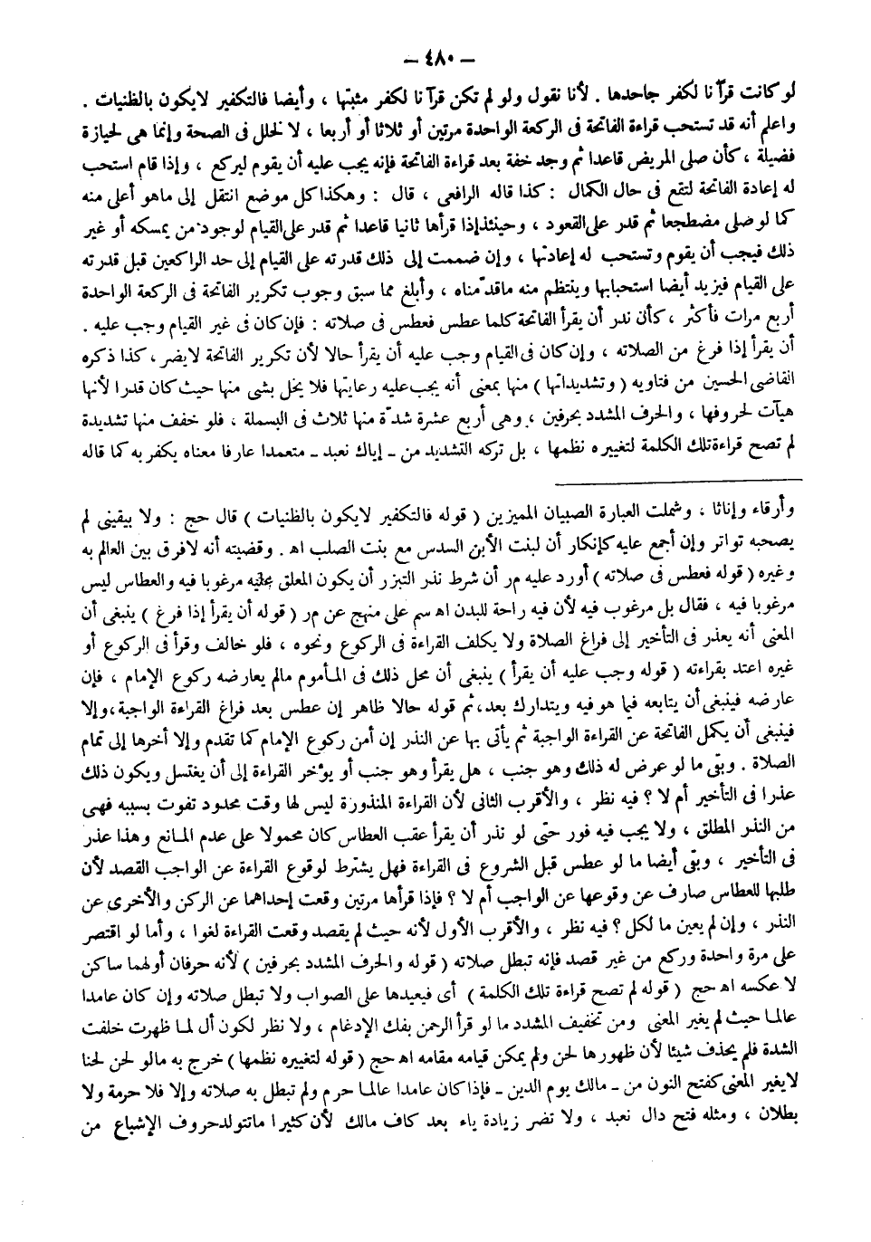 وَبَقِيَ مَا لَوْ عَرَضَ لَهُ ذَلِكَ وَهُوَ جُنُبٌ، هَلْ يَقْرَأُ وَهُوَ جُنُبٌ أَوْ يُؤَخِّرُ الْقِرَاءَةَ إلَى أَنْ يَغْتَسِلَ وَيَكُونَ ذَلِكَ عُذْرًا فِي التَّأْخِيرِ أَمْ لَا؟ فِيهِ نَظَرٌ، وَالْأَقْرَبُ الثَّانِي لِأَنَّ الْقِرَاءَةَ الْمَنْذُورَةَ لَيْسَ لَهَا وَقْتٌ مَحْدُودٌ تَفُوتُ بِسَبَبِهِ فَهِيَ مِنْ النَّذْرِ الْمُطْلَقِ، وَلَا يَجِبُ فِيهِ فَوْرٌ حَتَّى لَوْ نَذَرَ أَنْ يَقْرَأَ عَقِبَ الْعُطَاسِ كَانَ مَحْمُولًا عَلَى عَدَمِ الْمَانِعِ وَهَذَا عُذْرٌ فِي التَّأْخِيرِ، وَبَقِيَ أَيْضًا مَا لَوْ عَطَسَ قَبْلَ الشُّرُوعِ فِي الْقِرَاءَةِ فَهَلْ يُشْتَرَطُ لِوُقُوعِ الْقِرَاءَةِ عَنْ الْوَاجِبِ الْقَصْدِ لِأَنَّ طَلَبَهَا لِلْعُطَاسِ صَارِفٌ عَنْ وُقُوعِهَا عَنْ الْوَاجِبِ أَمْ لَا؟ فَإِذَا قَرَأَهَا مَرَّتَيْنِ وَقَعَتْ إحْدَاهُمَا عَنْ الرُّكْنِ وَالْأُخْرَى عَنْ النَّذْرِ، وَإِنْ لَمْ يُعَيِّنْ مَا لِكُلٍّ؟ فِيهِ نَظَرٌ، وَالْأَقْرَبُ الْأَوَّلُ لِأَنَّهُ حَيْثُ لَمْ يَقْصِدْ وَقَعَتْ الْقِرَاءَةُ لَغْوًا، وَأَمَّا لَوْ اقْتَصَرَ عَلَى مَرَّةٍ وَاحِدَةٍ وَرَكَعَ مِنْ غَيْرِ قَصْدٍ فَإِنَّهُ تَبْطُلُ صَلَاتُهُ (قَوْلُهُ: وَالْحَرْفُ الْمُشَدَّدُ بِحَرْفَيْنِ) لِأَنَّهُ حَرْفَانِ أَوَّلُهُمَا سَاكِنٌ لَا عَكْسُهُ اهـ حَجّ (قَوْلُهُ: لَمْ تَصِحَّ قِرَاءَةُ تِلْكَ الْكَلِمَةِ) أَيْ فَيُعِيدُهَا عَلَى الصَّوَابِ وَلَا تَبْطُلُ صَلَاتُهُ وَإِنْ كَانَ عَامِدًا عَالِمًا حَيْثُ لَمْ يُغَيِّرْ الْمَعْنَى وَمِنْ تَخْفِيفِ الْمُشَدَّدِ مَا لَوْ قَرَأَ الرَّحْمَنَ بِفَكِّ الْإِدْغَامِ، وَلَا نَظَرَ لِكَوْنِ أَلْ لَمَّا ظَهَرَتْ خَلَفَتْ الشَّدَّةَ فَلَمْ يَحْذِفْ شَيْئًا لِأَنَّ ظُهُورَهَا لَحْنٌ وَلَمْ يُمْكِنْ قِيَامُهُ مَقَامَهُ اهـ حَجّ (قَوْلُهُ لِتَغْيِيرِهِ نَظْمَهَا) خَرَجَ بِهِ مَا لَوْ لَحَنَ لَحْنًا لَا يُغَيِّرُ الْمَعْنَى كَفَتْحِ النُّونِ مِنْ مَالِكِ يَوْمِ الدِّينِ فَإِذَا كَانَ عَامِدًا عَالِمًا حَرُمَ وَلَمْ تَبْطُلْ بِهِ صَلَاتُهُ وَإِلَّا فَلَا حُرْمَةَ وَلَا بُطْلَانَ، وَمِثْلُهُ فَتْحُ دَالِ نَعْبُدُ، وَلَا تَضُرُّ زِيَادَةُ يَاءٍ بَعْدَ كَافِ مَالِكِ لِأَنَّ كَثِيرًا مَا تَتَوَلَّدُ حُرُوفُ الْإِشْبَاعِ مِنْ