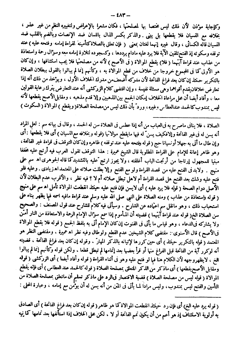 ـــــــــــــــــــــــــــــSالصَّلَاةِ، فَلَا يُنَافِي مَا صَرَّحَ بِهِ فِي الْعُبَابِ مِنْ أَنَّهُ إذَا عَطَسَ فِي الصَّلَاةِ سُنَّ لَهُ الْحَمْدُ، وَقَالَ فِي بَيَانِهِ سم: لَعَلَّ الْمُرَادَ أَنَّهُ يُسَنُّ لَهُ فِي غَيْرِ الْفَاتِحَةِ وَإِلَّا فَكَيْفَ يُسَنُّ لَهُ فِيهَا مَا يَقْطَعُ مُوَالَاتِهَا (قَوْلُهُ: وَبِخِلَافِهِ مَعَ النِّسْيَانِ) أَيْ فَلَا يَقْطَعُهَا: أَيْ وَإِنْ طَالَ مَا أَتَى بِهِ جَهْلًا أَوْ نِسْيَانًا حَجّ (قَوْلُهُ: وَفَتَحَهُ عَلَيْهِ عِنْدَ تَوَقُّفِهِ) ظَاهِرُهُ وَإِنْ كَانَ التَّوَقُّفُ فِي قِرَاءَةِ غَيْرِ الْفَاتِحَةِ، وَهُوَ ظَاهِرٌ إعَانَةً لِلْإِمَامِ عَلَى الْقِرَاءَةِ الْمَطْلُوبَةِ قَالَ الشَّيْخُ عَمِيرَةُ: هَذَا التَّوَقُّفُ تَقُولُ الْعَرَبُ فِيهِ اُرْتُجَّ عَلَيْهِ مُخَفَّفًا مَبْنِيًّا لِلْمَجْهُولِ إرْتَاجًا مِنْ أَرْتَجْتُ الْبَابَ أَغْلَقْته، وَلَا يَجُوزُ ارْتَجَّ عَلَيْهِ بِالتَّشْدِيدِ كَمَا قَالَهُ الْجَوْهَرِيُّ اهـ سم عَلَى مَنْهَجٍ.