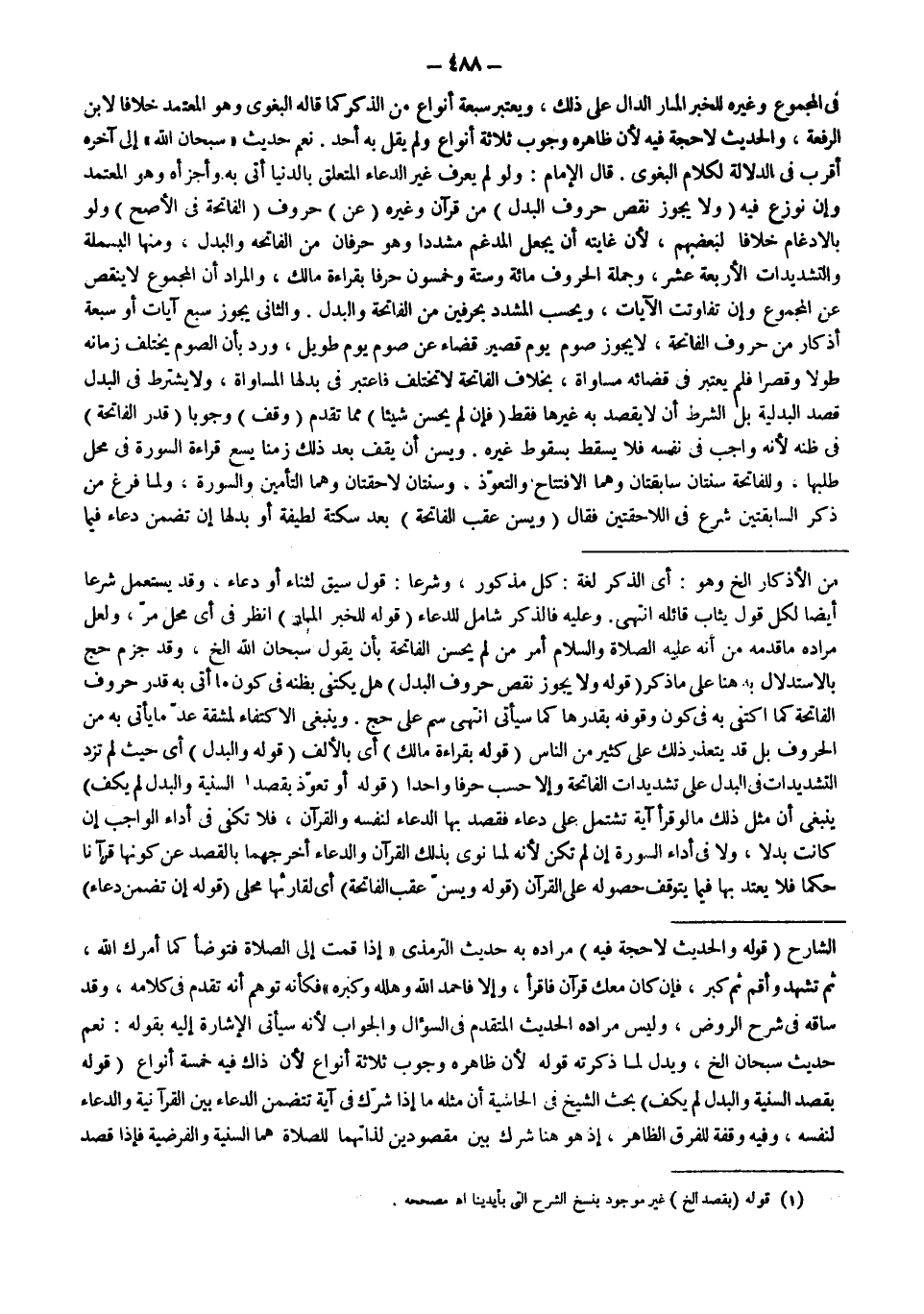 وَعَلَيْهِ فَالذِّكْرُ شَامِلٌ لِلدُّعَاءِ (قَوْلُهُ: لِلْخَبَرِ الْمَارِّ) اُنْظُرْ فِي أَيِّ مَحَلٍّ مَرَّ، وَلَعَلَّ مُرَادَهُ مَا قَدَّمَهُ مِنْ «أَنَّهُ - عَلَيْهِ الصَّلَاةُ وَالسَّلَامُ - أَمَرَ مَنْ لَمْ يُحْسِنْ الْفَاتِحَةَ بِأَنْ يَقُولَ سُبْحَانَ اللَّهِ» إلَخْ، وَقَدْ جَزَمَ حَجّ بِالِاسْتِدْلَالِ بِهِ هُنَا عَلَى مَا ذُكِرَ (قَوْلُهُ وَلَا يَجُوزُ نَقْصُ حُرُوفِ الْبَدَلِ) هَلْ يَكْتَفِي بِظَنِّهِ فِي كَوْنِ مَا أَتَى بِهِ قَدْرَ حُرُوفِ الْفَاتِحَةِ كَمَا اكْتَفَى بِهِ فِي كَوْنِ وُقُوفِهِ بِقَدْرِهَا كَمَا سَيَأْتِي انْتَهَى سم عَلَى حَجّ.