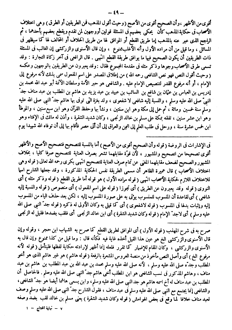 قَالَ الرَّافِعِيُّ فِي آخِرِ زَكَاةِ التِّجَارَةِ: وَقَدْ تُسَمَّى طُرُقُ الْأَصْحَابِ وُجُوهًا وَذَكَرَ مِثْلَهُ فِي مُقَدِّمَةِ الْمَجْمُوعِ فَقَالَ: وَقَدْ يُعَبِّرُونَ عَنْ الطَّرِيقَيْنِ بِالْوَجْهَيْنِ وَعَكْسِهِ (وَحَيْثُ أَقُولُ النَّصُّ فَهُوَ نَصُّ الشَّافِعِيِّ - رَحِمَهُ اللَّهُ -) مِنْ إطْلَاقِ الْمَصْدَرِ عَلَى اسْمِ الْمَفْعُولِ سُمِّيَ بِذَلِكَ؛ لِأَنَّهُ مَرْفُوعٌ إلَى الْإِمَامِ، أَوْ أَنَّهُ مَرْفُوعُ الْقَدْرِ لِتَنْصِيصِ الْإِمَامِ عَلَيْهِ. وَالشَّافِعِيُّ هُوَ حَبْرُ الْأُمَّةِ وَسُلْطَانُ الْأَئِمَّةِ أَبُو عَبْدِ اللَّهِ مُحَمَّدِ بْنِ إدْرِيسَ بْنِ الْعَبَّاسِ بْنِ عُثْمَانَ بْنِ شَافِعِ بْنِ السَّائِبِ بْنِ عُبَيْدِ بْنِ عَبْدِ يَزِيدَ بْنِ هَاشِمِ بْنِ الْمُطَّلِبِ بْنِ عَبْدِ مَنَافٍ جَدِّ النَّبِيِّ - صَلَّى اللَّهُ عَلَيْهِ وَسَلَّمَ -، وَالنِّسْبَةُ إلَيْهِ شَافِعِيٌّ لَا شَفْعَوِيٌّ، وُلِدَ بِغَزَّةَ الَّتِي تُوُفِّيَ بِهَا هَاشِمُ جَدُّ النَّبِيِّ - صَلَّى اللَّهُ عَلَيْهِ وَسَلَّمَ - سَنَةَ خَمْسِينَ وَمِائَةٍ، ثُمَّ حُمِلَ إلَى مَكَّةَ وَهُوَ ابْنُ سَنَتَيْنِ، وَنَشَأَ بِهَا وَحَفِظَ الْقُرْآنَ وَهُوَ ابْنُ سَبْعِ سِنِينَ، وَالْمَوْطَأَ وَهُوَ ابْنُ عَشْرِ سِنِينَ، تَفَقَّهَ بِمَكَّةَ عَلَى مُسْلِمِ بْنِ خَالِدٍ الزَّنْجِيِّ، وَكَانَ شَدِيدَ الشُّقْرَةِ، وَأَذِنَ لَهُ مَالِكٌ فِي الْإِفْتَاءِ وَهُوَ ابْنُ خَمْسَ عَشْرَةَ سَنَةً، وَرَحَلَ فِي طَلَبِ الْعِلْمِ إلَى الْيَمَنِ وَالْعِرَاقِ إلَى أَنْ أَتَى مِصْرَ فَأَقَامَ بِهَا إلَى أَنْ تَوَفَّاهُ اللَّهُ شَهِيدًا يَوْمَ