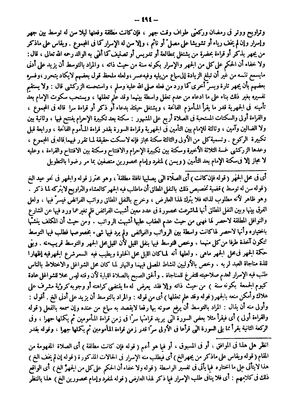 وَيُقَاسُ عَلَى مَا ذُكِرَ مَنْ يَجْهَرُ بِذِكْرٍ أَوْ قِرَاءَةٍ بِحَضْرَةِ مَنْ يَشْتَغِلُ بِمُطَالَعَةٍ أَوْ تَدْرِيسٍ أَوْ تَصْنِيفٍ كَمَا أَفْتَى بِهِ الْوَالِدُ - رَحِمَهُ اللَّهُ تَعَالَى -، قَالَ: وَلَا خَفَاءَ أَنَّ الْحُكْمَ عَلَى كُلٍّ مِنْ الْجَهْرِ وَالْإِسْرَارِ بِكَوْنِهِ سُنَّةً مِنْ حَيْثُ ذَاتُهُ، وَالْمُرَادُ بِالتَّوَسُّطِ أَنْ يَزِيدَ عَلَى أَدْنَى مَا يُسْمِعُ نَفْسَهُ مِنْ غَيْرِ أَنْ تَبْلُغَ الزِّيَادَةُ إلَى سَمَاعِ مَنْ يَلِيهِ وَفِيهِ عُسْرٌ، وَلَعَلَّهُ مَلْحَظُ قَوْلِ بَعْضِهِمْ لَا يَكَادُ يَتَحَرَّرُ، وَفَسَّرَهُ بَعْضُهُمْ بِأَنْ يَجْهَرَ تَارَةً وَيُسِرَّ أُخْرَى كَمَا وَرَدَ مِنْ فِعْلِهِ - صَلَّى اللَّهُ عَلَيْهِ وَسَلَّمَ -، وَاسْتَحْسَنَهُ الزَّرْكَشِيُّ قَالَ: وَلَا يَسْتَقِيمُ تَفْسِيرُهُ بِغَيْرِ ذَلِكَ بِنَاءً عَلَى مَا ادَّعَاهُ مِنْ عَدَمِ تَعَقُّلِ وَاسِطَةٍ بَيْنَهُمَا وَقَدْ عُلِمَ تَعَقُّلُهَا، وَيُسْتَحَبُّ سُكُوتُ الْإِمَامِ بَعْدَ تَأْمِينِهِ فِي الْجَهْرِيَّةِ قَدْرَ مَا يَقْرَأُ الْمَأْمُومُ الْفَاتِحَةَ، وَيَشْتَغِلُ حِينَئِذٍ بِدُعَاءٍ أَوْ ذِكْرٍ أَوْ قِرَاءَةٍ سِرًّا قَالَهُ فِي الْمَجْمُوعِ، وَالْقِرَاءَةُ أَوْلَى وَالسَّكَتَاتُ الْمُسْتَحَبَّةُ فِي الصَّلَاةِ أَرْبَعٌ عَلَى الْمَشْهُورِ: سَكْتَةٌ بَعْدَ تَكْبِيرَةِ الْإِحْرَامِ يَفْتَتِحُ فِيهَا، وَثَانِيَةٌ بَيْنَ وَلَا الضَّالِّينَ وَآمِينَ، وَثَالِثَةٌ لِلْإِمَامِ بَيْنَ التَّأْمِينِ فِي الْجَهْرِيَّةِ وَقِرَاءَةِ السُّورَةِ بِقَدْرِ قِرَاءَةِ الْمَأْمُومِ الْفَاتِحَةَ، وَرَابِعَةٌ قَبْلَ تَكْبِيرَةِ الرُّكُوعِ.