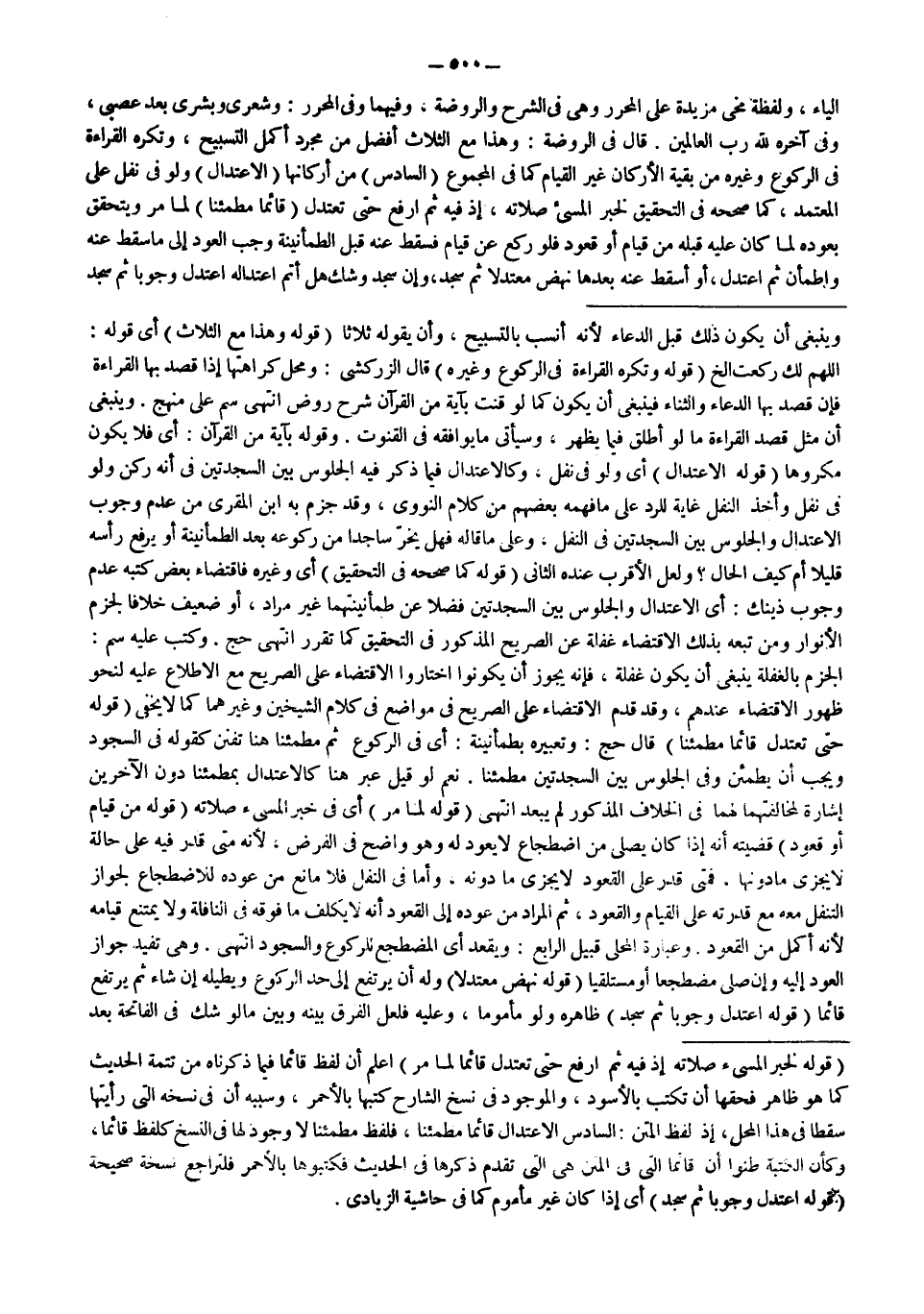 وَكَتَبَ عَلَيْهِ سم: الْجَزْمُ بِالْغَفْلَةِ يَنْبَغِي أَنْ يَكُونَ غَفْلَةً، فَإِنَّهُ يَجُوزُ أَنْ يَكُونُوا اخْتَارُوا الِاقْتِضَاءَ عَلَى الصَّرِيحِ مَعَ الِاطِّلَاعِ عَلَيْهِ لِنَحْوِ ظُهُورِ الِاقْتِضَاءِ عِنْدَهُمْ، وَقَدْ قُدِّمَ الِاقْتِضَاءُ عَلَى الصَّرِيحِ فِي مَوَاضِعَ فِي كَلَامِ الشَّيْخَيْنِ وَغَيْرِهِمَا كَمَا لَا يَخْفَى (قَوْلُهُ: «حَتَّى تَعْتَدِلَ قَائِمًا مُطْمَئِنًّا» ) قَالَ حَجّ: وَتَعْبِيرُهُ بِطُمَأْنِينَةٍ: أَيْ فِي الرُّكُوعِ ثُمَّ مُطْمَئِنًّا هُنَا تَفَنُّنٌ كَقَوْلِهِ فِي السُّجُودِ وَيَجِبُ أَنْ يَطْمَئِنَّ وَفِي الْجُلُوسِ بَيْنَ السَّجْدَتَيْنِ مُطْمَئِنًّا.