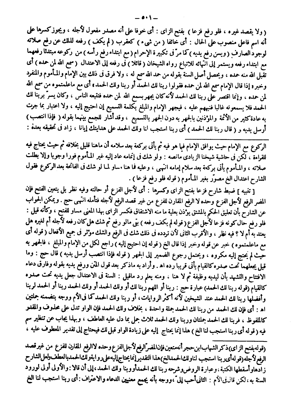 وَيُمْكِنُ الْجَوَابُ عَنْ الشَّارِحِ بِأَنَّ تَعْلِيقَ الْحُكْمِ بِالْمُشْتَقِّ يُؤْذِنُ بِعَلِيَّةِ مَا مِنْهُ الِاشْتِقَاقُ فَكَسْرُ الزَّايِ بِهَذَا الْمَعْنَى مُسَاوٍ لِلْفَتْحِ، وَكَأَنَّهُ قِيلَ: فَلَوْ رَفَعَ حَالَ كَوْنِهِ فَزَعًا لِأَجْلِ الْفَزَعِ (قَوْلُهُ لَمْ يَكْفِ رَفْعُهُ) بَقِيَ مَا لَوْ رَفَعَ ثُمَّ شَكَّ هَلْ كَانَ رَفْعُهُ لِأَجْلِهِ أَمْ لِغَيْرِهِ هَلْ يُعْتَدُّ بِهِ أَمْ لَا؟ فِيهِ نَظَرٌ، وَالْأَقْرَبُ الثَّانِي لِأَنَّ تَرَدُّدَهُ فِي ذَلِكَ شَكٌّ فِي الرَّفْعِ وَالشَّكُّ مُؤَثِّرٌ فِي جَمِيعِ الْأَفْعَالِ (قَوْلُهُ: أَيْ مَعَ مَا عَلِمْتُمُوهُ) خَبَرٌ عَنْ قَوْلِهِ وَخَبَرُ إذَا قَالَ إلَخْ (قَوْلُهُ: إنْ اُحْتِيجَ إلَيْهِ) رَاجِعٌ لِكُلٍّ مِنْ الْإِمَامِ وَالْمُبَلِّغِ، فَالْجَهْرُ بِهِ حَيْثُ لَمْ يَحْتَجْ إلَيْهِ مَكْرُوهٌ، وَيُحْتَمَلُ رُجُوعُ الضَّمِيرِ إلَى الْجَهْرِ (قَوْلُهُ: فَإِذَا انْتَصَبَ أَرْسَلَ يَدَيْهِ) قَالَ حَجّ: وَمَا قِيلَ يَجْعَلُهُمَا تَحْتَ صَدْرِهِ كَالْقِيَامِ يَأْتِي قَرِيبًا رَدُّهُ اهـ.
