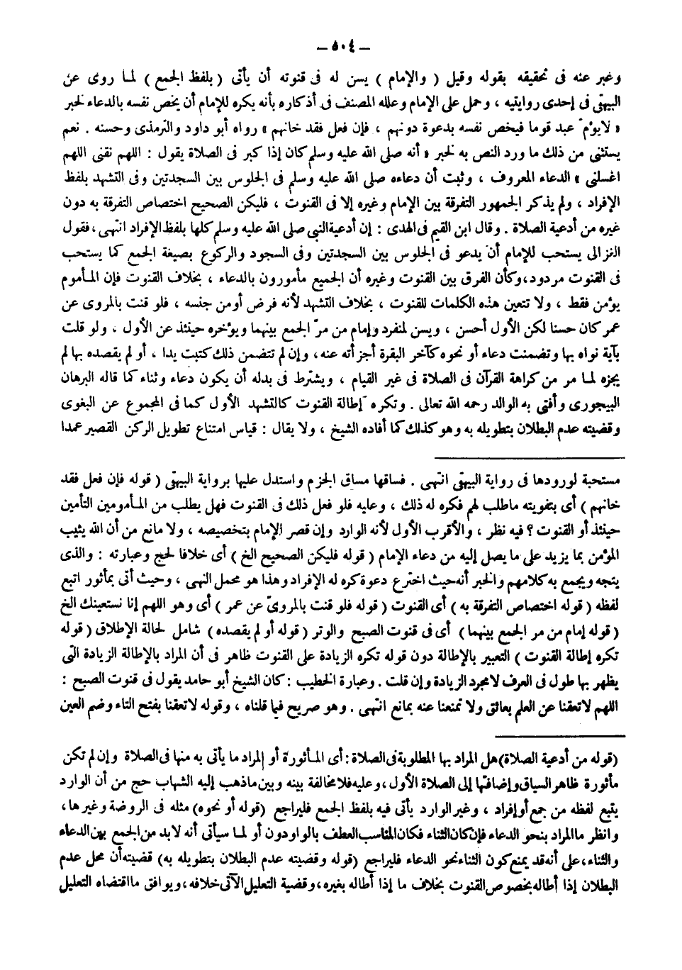وَعَبَّرَ عَنْهُ فِي تَحْقِيقِهِ بِقَوْلِهِ وَقِيلَ (وَالْإِمَامُ) يُسَنُّ لَهُ فِي قُنُوتِهِ أَنْ يَأْتِيَ (بِلَفْظِ الْجَمْعِ) لِمَا رُوِيَ عَنْ الْبَيْهَقِيّ فِي إحْدَى رِوَايَتَيْهِ، وَحُمِلَ عَلَى الْإِمَامِ وَعَلَّلَهُ الْمُصَنِّفُ فِي أَذْكَارِهِ بِأَنَّهُ يُكْرَهُ لِلْإِمَامِ أَنْ يَخُصَّ نَفْسَهُ بِالدُّعَاءِ لِخَبَرِ «لَا يَؤُمَّ عَبْدٌ قَوْمًا فَيَخُصُّ نَفْسَهُ بِدَعْوَةٍ دُونَهُمْ، فَإِنْ فَعَلَ فَقَدْ خَانَهُمْ» رَوَاهُ أَبُو دَاوُد وَالتِّرْمِذِيُّ وَحَسَّنَهُ.