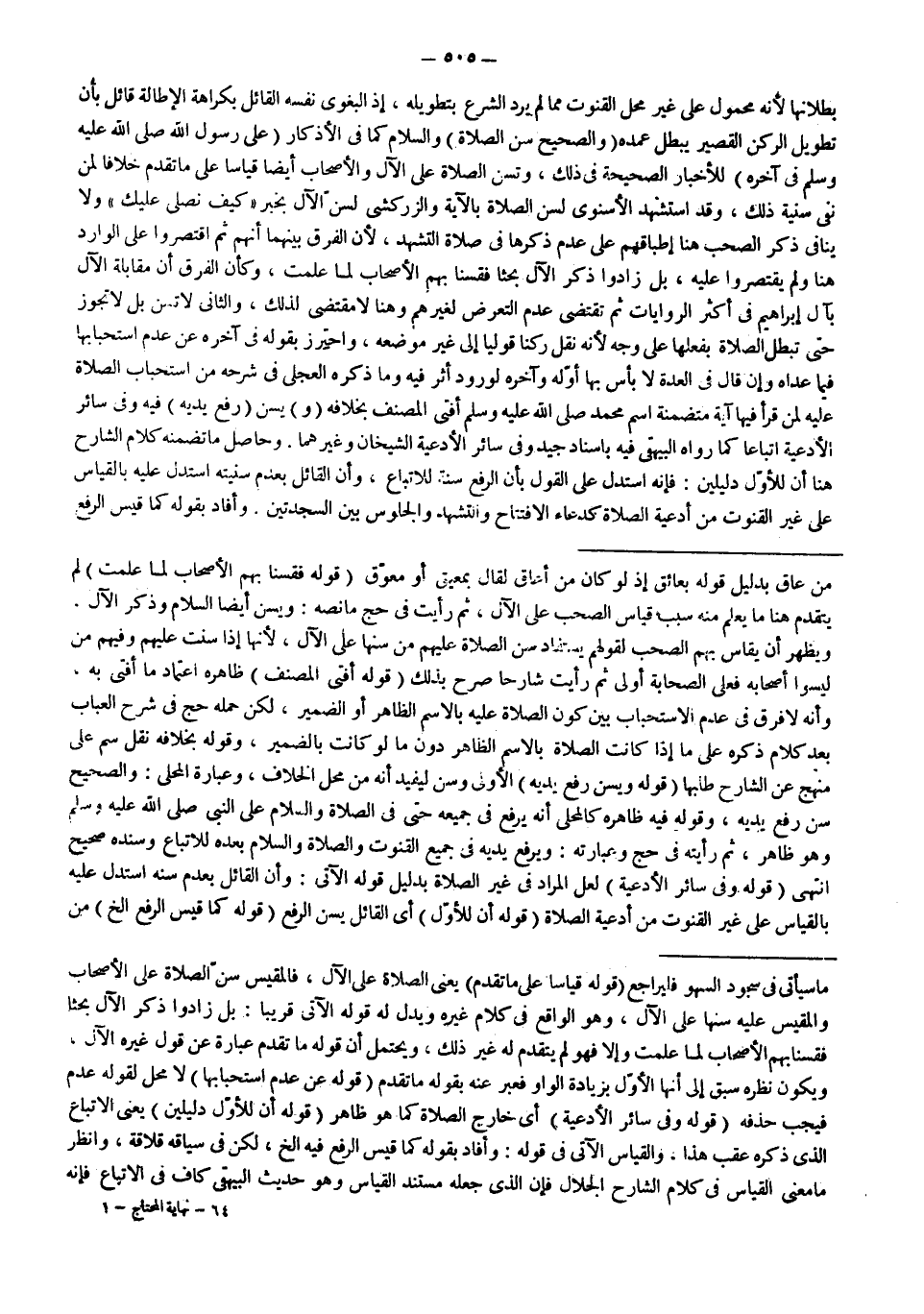 وَحَاصِلُ مَا تَضَمَّنَهُ كَلَامُ الشَّارِحِ هُنَا أَنَّ لِلْأَوَّلِ دَلِيلَيْنِ: فَإِنَّهُ اسْتَدَلَّ عَلَى الْقَوْلِ بِأَنَّ الرَّفْعَ سُنَّةٌ لِلِاتِّبَاعِ، وَأَنَّ الْقَائِلَ بِعَدَمِ سُنِّيَّتِهِ اسْتَدَلَّ عَلَيْهِ بِالْقِيَاسِ عَلَى غَيْرِ الْقُنُوتِ مِنْ أَدْعِيَةِ الصَّلَاةِ كَدُعَاءِ الِافْتِتَاحِ وَالتَّشَهُّدِ وَالْجُلُوسِ بَيْنَ السَّجْدَتَيْنِ.