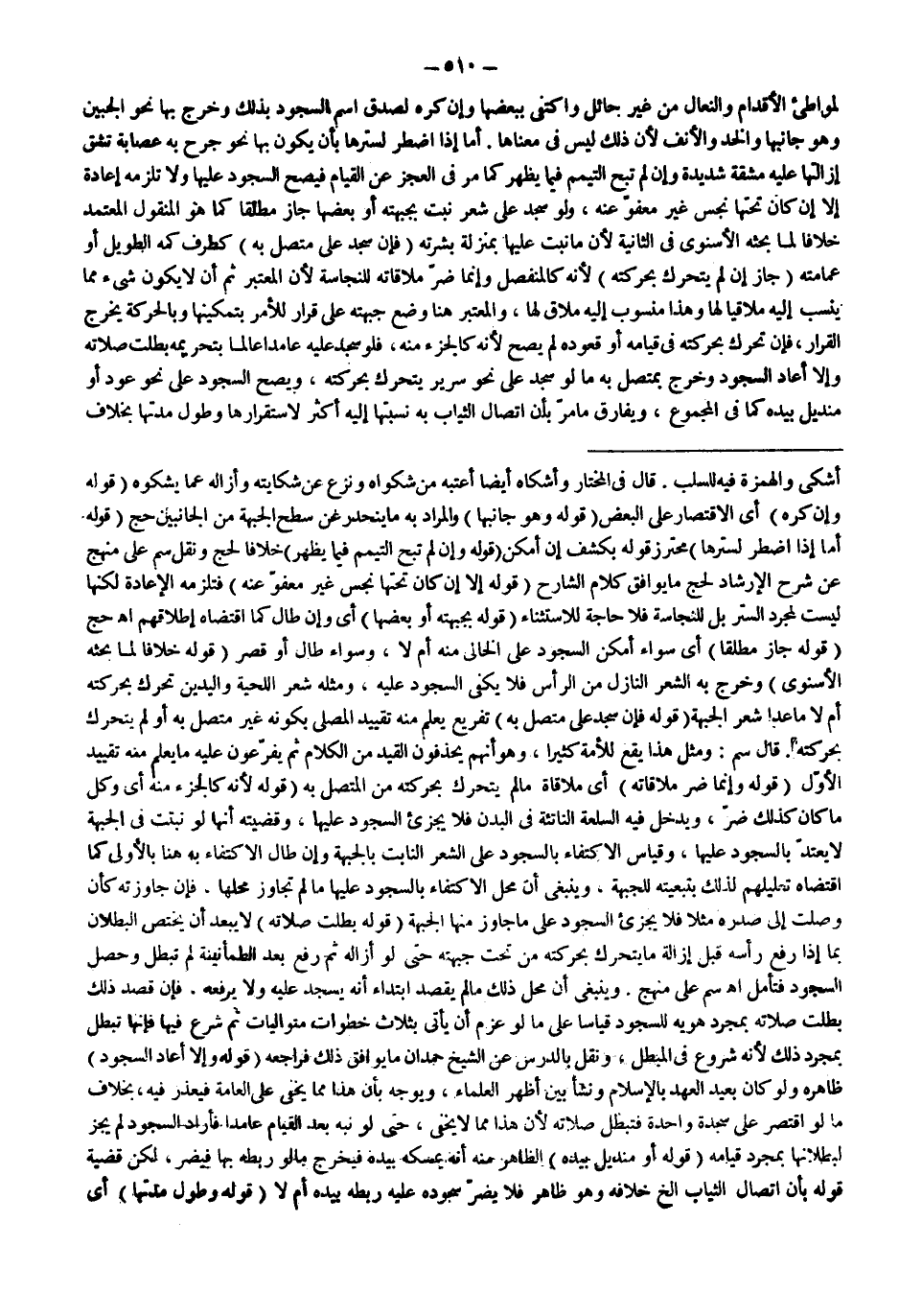 قَالَ فِي الْمُخْتَارِ وَأَشْكَاهُ أَيْضًا أَعْتَبَهُ مِنْ شَكْوَاهُ وَنَزَعَ عَنْ شِكَايَتِهِ وَأَزَالَهُ عَمَّا يَشْكُوهُ (قَوْلُهُ: وَإِنْ كُرِهَ) أَيْ الِاقْتِصَارُ عَلَى الْبَعْضِ (قَوْلُهُ وَهُوَ جَانِبُهَا) وَالْمُرَادُ بِهِ مَا يَنْحَدِرُ عَنْ سَطْحِ الْجَبْهَةِ مِنْ الْجَانِبَيْنِ حَجّ (قَوْلُهُ: أَمَّا إذَا اُضْطُرَّ لِسِتْرِهَا) مُحْتَرَزُ قَوْلِهِ بِكَشْفٍ إنْ أَمْكَنَ (قَوْلُهُ وَإِنْ لَمْ تُبَحْ التَّيَمُّمُ فِيمَا يَظْهَرُ) خِلَافًا لحج وَنَقَلَ سم عَلَى مَنْهَجٍ عَنْ شَرْحِ الْإِرْشَادِ لحج مَا يُوَافِقُ كَلَامَ الشَّارِحِ (قَوْلُهُ: إلَّا إنْ كَانَ تَحْتَهَا نَجَسٌ غَيْرُ مَعْفُوٍّ عَنْهُ) فَتَلْزَمُهُ الْإِعَادَةُ لَكِنَّهَا لَيْسَتْ لِمُجَرَّدِ السِّتْرِ بَلْ لِلنَّجَاسَةِ فَلَا حَاجَةَ لِلِاسْتِثْنَاءِ (قَوْلُهُ: بِجَبْهَتِهِ أَوْ بَعْضِهَا) أَيْ وَإِنْ طَالَ كَمَا اقْتَضَاهُ إطْلَاقُهُمْ اهـ حَجّ (قَوْلُهُ: جَازَ مُطْلَقًا) أَيْ سَوَاءٌ أَمْكَنَ السُّجُودُ عَلَى الْخَالِي مِنْهُ أَمْ لَا، وَسَوَاءٌ طَالَ أَوْ قَصُرَ (قَوْلُهُ: خِلَافًا لِمَا بَحَثَهُ الْإِسْنَوِيُّ) وَخَرَجَ بِهِ الشَّعْرُ النَّازِلُ مِنْ الرَّأْسِ فَلَا يَكْفِي السُّجُودُ عَلَيْهِ، وَمِثْلُهُ شَعْرُ اللِّحْيَةِ وَالْيَدَيْنِ تَحَرَّكَ بِحَرَكَتِهِ أَمْ لَا مَا عَدَا شَعْرَ الْجَبْهَةِ.