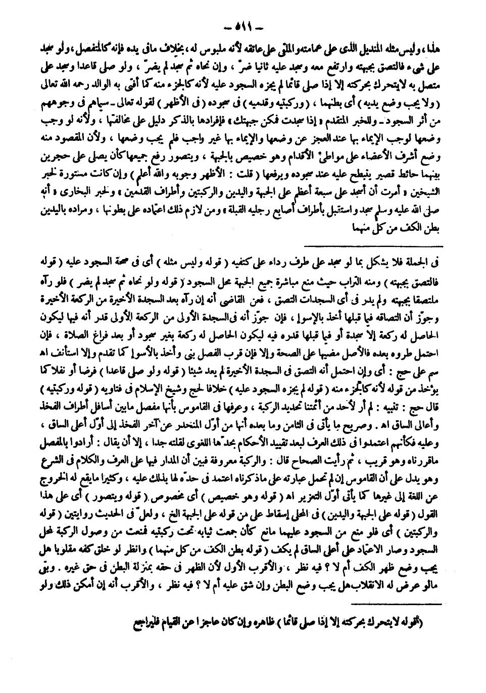 وَصَرِيحٌ مَا يَأْتِي فِي الثَّامِنِ وَمَا بَعْدَهُ أَنَّهَا مِنْ أَوَّلِ الْمُنْحَدِرِ عَنْ آخِرِ الْفَخِذِ إلَى أَوَّلِ أَعْلَى السَّاقِ، وَعَلَيْهِ فَكَأَنَّهُمْ اعْتَمَدُوا فِي ذَلِكَ الْعُرْفَ لِبُعْدِ تَقْيِيدِ الْأَحْكَامِ بِحَدِّهَا اللُّغَوِيِّ لِقِلَّتِهِ جِدًّا، إلَّا أَنْ يُقَالَ: أَرَادُوا بِالْمِفْصَلِ مَا قَرَّرْنَاهُ وَهُوَ قَرِيبٌ، ثُمَّ رَأَيْت الصِّحَاحَ قَالَ: وَالرُّكْبَةُ مَعْرُوفَةٌ فَبَيَّنَ أَنَّ الْمَدَارَ فِيهَا عَلَى الْعُرْفِ وَالْكَلَامُ فِي الشَّرْعِ وَهُوَ يَدُلُّ عَلَى أَنَّ الْقَامُوسَ إنْ لَمْ تُحْمَلْ عِبَارَتُهُ عَلَى مَا ذَكَرْنَاهُ اعْتَمَدَ فِي حَدِّهِ لَهَا بِذَلِكَ عَلَيْهِ، وَكَثِيرًا مَا يَقَعُ لَهُ الْخُرُوجُ عَنْ اللُّغَةِ إلَى غَيْرِهَا كَمَا يَأْتِي أَوَّلَ التَّعْزِيرِ اهـ (قَوْلُهُ وَهُوَ خِصِّيصٌ) أَيْ مَخْصُوصٌ (قَوْلُهُ: وَيُتَصَوَّرُ) أَيْ عَلَى هَذَا الْقَوْلِ (قَوْلُهُ: عَلَى الْجَبْهَةِ وَالْيَدَيْنِ) فِي الْمَحَلِّيِّ إسْقَاطُ عَلَى مِنْ قَوْلِهِ عَلَى الْجَبْهَةِ إلَخْ، وَلَعَلَّ فِي الْحَدِيثِ رِوَايَتَيْنِ (قَوْلُهُ وَالرُّكْبَتَيْنِ) أَيْ فَلَوْ مَنَعَ مِنْ السُّجُودِ عَلَيْهِمَا مَانِعٌ كَأَنْ جُمِعَتْ ثِيَابُهُ تَحْتَ رُكْبَتَيْهِ فَمَنَعَتْ مِنْ وُصُولِ الرُّكْبَةِ لِمَحَلِّ السُّجُودِ وَصَارَ الِاعْتِمَادُ عَلَى أَعْلَى السَّاقِ لَمْ يَكْفِ (قَوْلُهُ: بَطْنُ الْكَفِّ مِنْ كُلٍّ مِنْهُمَا) وَانْظُرْ لَوْ خُلِقَ كَفُّهُ مَقْلُوبًا هَلْ يَجِبُ وَضْعُ ظَهْرِ الْكَفِّ أَمْ لَا؟ فِيهِ نَظَرٌ، وَالْأَقْرَبُ الْأَوَّلُ لِأَنَّ الظَّهْرَ فِي حَقِّهِ بِمَنْزِلَةِ الْبَطْنِ فِي حَقِّ غَيْرِهِ، وَبَقِيَ مَا لَوْ عَرَضَ لَهُ الِانْقِلَابُ هَلْ يَجِبُ وَضْعُ الْبَطْنِ وَإِنْ شَقَّ عَلَيْهِ أَمْ لَا؟ فِيهِ نَظَرٌ، وَالْأَقْرَبُ أَنَّهُ إنْ أَمْكَنَ ذَلِكَ وَلَوْ