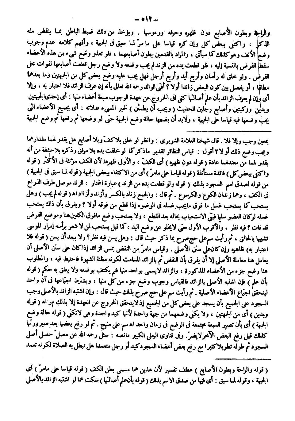 قَالَ شَيْخُنَا الْعَلَّامَةُ الشَّوْبَرِيُّ: وَانْظُرْ لَوْ خُلِقَ بِلَا كَفٍّ وَبِلَا أَصَابِعَ هَلْ يُقَدِّرُ لَهُمَا مِقْدَارَهُمَا وَيَجِبُ وَضْعُ ذَلِكَ أَوْ لَا؟ أَقُولُ: قِيَاسُ النَّظَائِرِ تَقْدِيرُ مَا ذُكِرَ كَمَا لَوْ خُلِقَتْ يَدُهُ بِلَا مِرْفَقٍ وَذَكَرَهُ بِلَا حَشَفَةٍ مِنْ أَنَّهُ يُقَدِّرُ لَهُمَا مِنْ مُعْتَدِلِهِمَا عَادَةً (قَوْلُهُ: دُونَ ظَهْرِهِ) أَيْ الْكَفِّ، وَالْأَوْلَى ظَهْرُهَا لِأَنَّ الْكَفَّ مُؤَنَّثَةٌ فِي الْأَكْثَرِ (قَوْلُهُ: وَاكْتَفَى بِبَعْضِ كُلٍّ) فَائِدَةٌ مُسْتَأْنَفَةٌ (قَوْلُهُ: قِيَاسًا عَلَى مَا مَرَّ) أَيْ مِنْ الِاكْتِفَاءِ بِبَعْضِ الْجَبْهَةِ (قَوْلُهُ: لِمَا سَبَقَ فِي الْجَبْهَةِ) مِنْ قَوْلِهِ لَصَدَقَ اسْمُ السُّجُودِ بِذَلِكَ (قَوْلُهُ: وَلَوْ قُطِعَتْ يَدُهُ مِنْ الزَّنْدِ) عِبَارَةُ الْمُخْتَارِ: الزَّنْدُ مَوْصِلُ طَرَفِ الذِّرَاعِ فِي الْكَفِّ، وَهُمَا زَنْدَانِ الْكُوعُ وَالْكُرْسُوعُ.