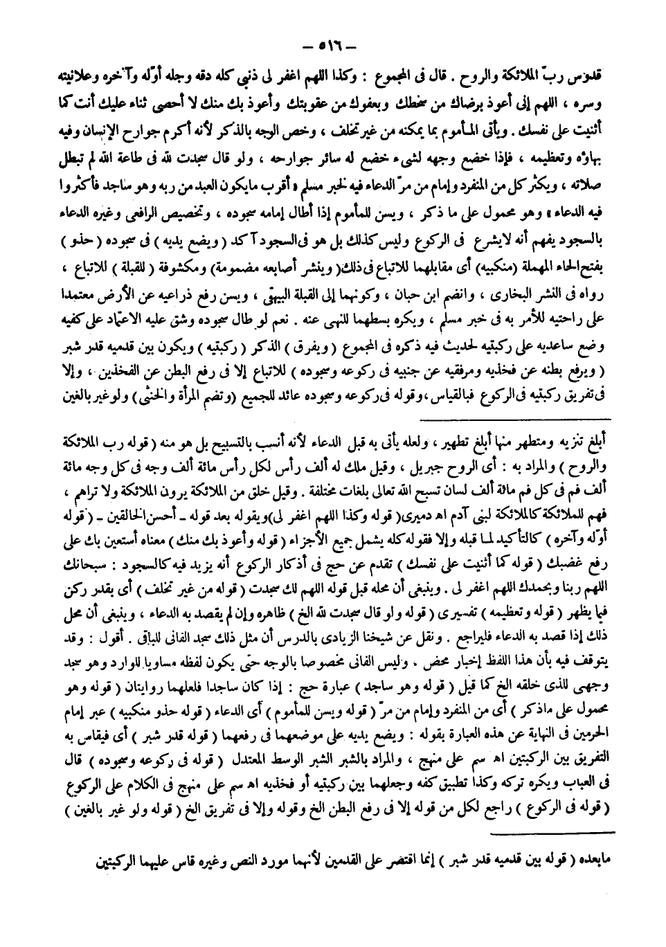 وَقِيلَ خَلْقٌ مِنْ الْمَلَائِكَةِ يَرَوْنَ الْمَلَائِكَةَ وَلَا تَرَاهُمْ، فَهُمْ لِلْمَلَائِكَةِ كَالْمَلَائِكَةِ لِبَنِي آدَمَ اهـ دَمِيرِيٌّ (قَوْلُهُ: وَكَذَا اللَّهُمَّ اغْفِرْ لِي) وَيَقُولُ بَعْدَ قَوْلِهِ أَحْسَنَ الْخَالِقِينَ (قَوْلُهُ أَوَّلَهُ وَآخِرَهُ) كَالتَّأْكِيدِ لِمَا قَبْلَهُ وَإِلَّا فَقَوْلُهُ كُلُّهُ يَشْمَلُ جَمِيعَ الْأَجْزَاءِ (قَوْلُهُ: وَأَعُوذُ بِك مِنْك) مَعْنَاهُ أَسْتَعِينُ بِك عَلَى رَفْعِ غَضَبِك (قَوْلُهُ كَمَا أَثْنَيْت عَلَى نَفْسِك) تَقَدَّمَ عَنْ حَجّ فِي أَذْكَارِ الرُّكُوعِ أَنَّهُ يَزِيدُ فِيهِ كَالسُّجُودِ: سُبْحَانَك اللَّهُمَّ رَبَّنَا وَبِحَمْدِك اللَّهُمَّ اغْفِرْ لِي،