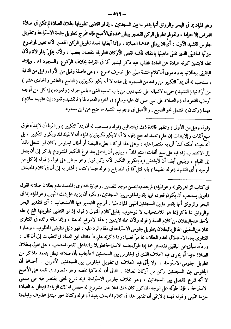 فَمَرْجِعُ الضَّمِيرِ فِيهَا الِاسْتِحْبَابُ: أَيْ فَتَقْدِيرُ الْبَحْرِ وَالرَّوْنَقِ بِمَا ذُكِرَ إنَّمَا هُوَ لِلِاسْتِحْبَابِ لَا لِلْوُجُوبِ بِدَلِيلِ كَلَامِ الْمُتَوَلِّي (قَوْلُهُ إذْ لَوْ اقْتَضَى تَطْوِيلَهَا إلَخْ) عِلَّةٌ لِأَخْذِ عَدَمِ الْبُطْلَانِ مِنْ كَلَامِ التَّتِمَّةِ (قَوْلُهُ: وَلِأَنَّ مَحَلَّهُ لَا يَتَمَيَّزُ) هَذَا لَا مَوْقِعَ لَهُ هُنَا، وَإِنَّمَا سَاقَهُ وَالِدُهُ فِي الْفَتَاوَى نَقْلًا عَنْ الْبُلْقِينِيِّ الْقَائِلِ بِالْبُطْلَانِ بِتَطْوِيلِ جُلُوسِ الِاسْتِرَاحَةِ فِي مَقَامِ الرَّدِّ عَلَيْهِ، فَهُوَ دَلِيلٌ لِنَقِيضِ الْمَطْلُوبِ، وَعِبَارَةُ الْفَتَاوَى بَعْدَ الِاسْتِدْلَالِ لِعَدَمِ الْبُطْلَانِ بِمَا مَرَّ نَصُّهَا: وَبِمَا ذَكَرْته عُلِمَ رَدُّ مَا قَالَهُ ابْنُ الْعِمَادِ فِي التَّعَقُّبَاتِ إلَى أَنْ قَالَ: وَرَدَ مَا سَيَأْتِي عَنْ الْبُلْقِينِيِّ فَقَدْ سُئِلَ عَمَّا إذَا طَوَّلَ جِلْسَةَ الِاسْتِرَاحَةِ تَطْوِيلًا زَائِدًا عَلَى الْقَدْرِ الْمُسْتَحَبِّ، هَلْ نَقُولُ بِبُطْلَانِ الصَّلَاةِ جَزْمًا أَوْ يُجْرَى فِيهِ الْخِلَافُ الَّذِي فِي الْجُلُوسِ بَيْنَ السَّجْدَتَيْنِ؟ فَأَجَابَ بِأَنَّ صَلَاتَهُ تَبْطُلُ بِتَعَمُّدِ مَا ذُكِرَ مِنْ تَطْوِيلِ جُلُوسِ الِاسْتِرَاحَةِ، وَلَا يَأْتِي فِيهِ الْخِلَافُ فِي تَطْوِيلِ الْجُلُوسِ بَيْنَ السَّجْدَتَيْنِ لِأَمْرَيْنِ: أَحَدِهِمَا أَنَّ الْجُلُوسَ بَيْنَ السَّجْدَتَيْنِ رُكْنٌ مِنْ أَرْكَانِ الصَّلَاةِ.