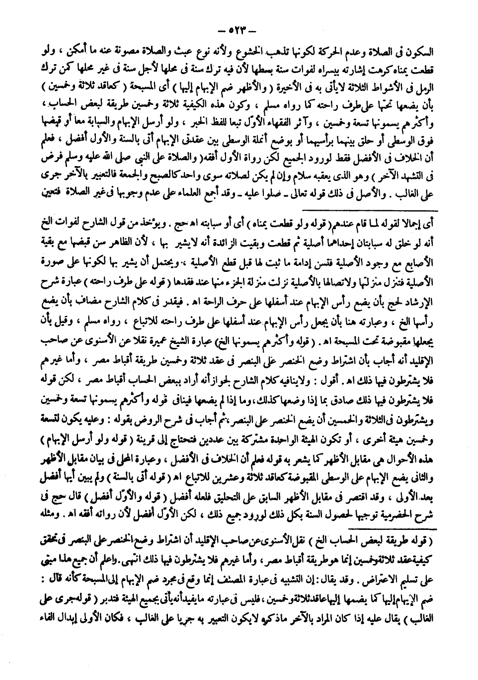 السُّكُونِ فِي الصَّلَاةِ وَعَدَمِ الْحَرَكَةِ لِكَوْنِهَا تُذْهِبُ الْخُشُوعَ وَلِأَنَّهُ نَوْعُ عَبَثٍ وَالصَّلَاةُ مَصُونَةٌ عَنْهُ مَا أَمْكَنَ، وَلَوْ قُطِعَتْ يُمْنَاهُ كُرِهَتْ إشَارَتُهُ بِيُسْرَاهُ لِفَوَاتِ سُنَّةِ بَسْطِهَا لِأَنَّ فِيهِ تَرْكَ سُنَّةٍ فِي مَحَلِّهَا لِأَجْلِ سُنَّةٍ فِي غَيْرِ مَحَلِّهَا كَمَنْ تَرَكَ الرَّمَلَ فِي الْأَشْوَاطِ الثَّلَاثَةِ لَا يَأْتِي بِهِ فِي الْأَخِيرَةِ (وَالْأَظْهَرُ ضَمُّ الْإِبْهَامِ إلَيْهَا) أَيْ الْمُسَبِّحَةِ (كَعَاقِدٍ ثَلَاثَةً وَخَمْسِينَ) بِأَنْ يَضَعَهَا تَحْتَهَا عَلَى طَرَفِ رَاحَتِهِ كَمَا رَوَاهُ مُسْلِمٌ، وَكَوْنُ هَذِهِ الْكَيْفِيَّةِ ثَلَاثَةً وَخَمْسِينَ طَرِيقَةٌ لِبَعْضِ الْحُسَّابِ، وَأَكْثَرُهُمْ يُسَمُّونَهَا تِسْعَةً وَخَمْسِينَ، وَآثَرَ الْفُقَهَاءُ الْأَوَّلَ تَبَعًا لِلَّفْظِ الْخَبَرِ، وَلَوْ أَرْسَلَ الْإِبْهَامَ وَالسَّبَّابَةَ مَعًا أَوْ قَبَضَهَا فَوْقَ الْوُسْطَى أَوْ حَلَّقَ بَيْنَهُمَا بِرَأْسَيْهِمَا أَوْ بِوَضْعِ أُنْمُلَةِ الْوُسْطَى بَيْنَ عُقْدَتَيْ الْإِبْهَامِ أَتَى بِالسُّنَّةِ وَالْأَوَّلُ أَفْضَلُ، فَعُلِمَ أَنَّ الْخِلَافَ فِي الْأَفْضَلِ فَقَطْ لِوُرُودِ الْجَمِيعِ لَكِنَّ رُوَاةَ الْأَوَّلِ أَفْقَهُ