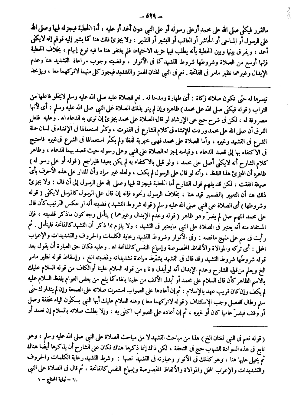 ثُمَّ رَأَيْت فِي سم عَلَى مَنْهَجٍ مَا نَصُّهُ: وَفِي الْأَنْوَارِ وَشُرُوطُ التَّشَهُّدِ رِعَايَةُ الْكَلِمَاتِ وَالْحُرُوفِ وَالتَّشْدِيدَاتِ وَالْإِعْرَابِ الْمُخِلِّ: أَيْ تَرْكُهُ وَالْمُوَالَاةُ وَالْأَلْفَاظُ الْمَخْصُوصَةُ وَإِسْمَاعُ النَّفْسِ كَالْفَاتِحَةِ اهـ.