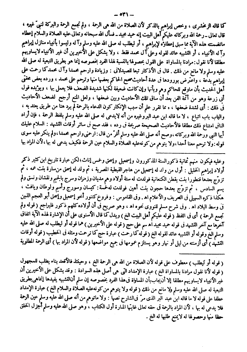 وَفِي شَرْحِ مُسْلِمٍ لِلنَّوَوِيِّ نَحْوُهُ اهـ، وَهُوَ صَرِيحٌ فِي أَنَّ أَوْلَادَهُ كُلَّهُمْ ذُكُورٌ فَلْيُرَاجَعْ (قَوْلُهُ: وَلَمْ تَجْمَعْ الرَّحْمَةُ) أَيْ فِي اللَّفْظِ (قَوْلُهُ: عَلَيْكُمْ أَهْلَ الْبَيْتِ إلَخْ) وَيَدُلُّ كَمَا قَالَ الْإِسْنَوِيُّ عَلَى أَنَّ الْإِشَارَةَ لِهَذِهِ الْآيَةِ اتِّفَاقُ آخِرِهَا مَعَ آخِرِ التَّشَهُّدِ فِي قَوْلِهِ حَمِيدٌ مَجِيدٌ اهـ سم عَلَى حَجّ (قَوْلُهُ: عَلَى الْأَخِيرَيْنِ) هُمَا قَوْلُهُ أَوْ لِيَطْلُبْ لَهُ - صَلَّى اللَّهُ عَلَيْهِ وَسَلَّمَ - إلَخْ وَقَوْلُهُ أَوْ التَّشْبِيهُ عَائِدٌ لِقَوْلِهِ إلَخْ (قَوْلُهُ: كَمَا رَحِمْت) عِبَارَةُ حَجّ كَمَا تَرَحَّمْت وَمِثْلُهُ فِي الْخَطِيبِ (قَوْلُهُ: أَوْقَاتُ التَّشَهُّدِ) أَيْ أَزْمِنَتُهُ مِنْ لَيْلٍ أَوْ نَهَارٍ وَهُوَ يَسْتَلْزِمُ عُمُومَهَا فِي جَمِيعِ مَوَاضِعِهَا (قَوْلُهُ: لِأَنَّ الْمُرَادَ بِهَا) أَيْ الرَّحْمَةِ الْمَطْلُوبَةِ