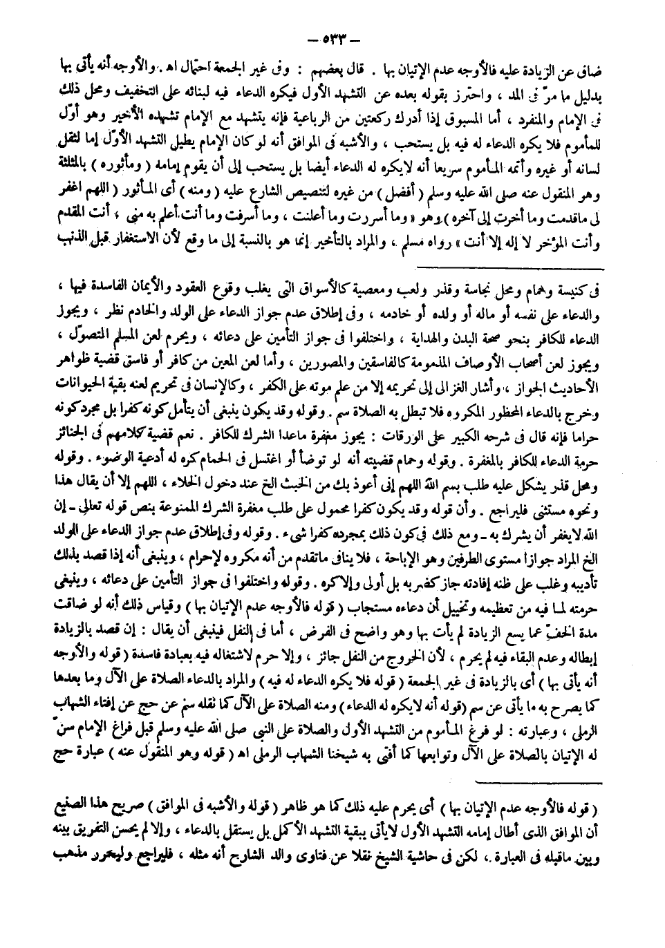وَقَوْلُهُ وَاخْتَلَفُوا فِي جَوَازِ التَّأْمِينِ عَلَى دُعَائِهِ، وَيَنْبَغِي حُرْمَتُهُ لِمَا فِيهِ مِنْ تَعْظِيمِهِ وَتَخْيِيلِ أَنَّ دُعَاءَهُ مُسْتَجَابٌ (قَوْلُهُ: فَالْأَوْجَهُ عَدَمُ الْإِتْيَانِ بِهَا) وَقِيَاسُ ذَلِكَ أَنَّهُ لَوْ ضَاقَتْ مُدَّةُ الْخُفِّ عَمَّا يَسَعُ الزِّيَادَةَ لَمْ يَأْتِ بِهَا وَهُوَ وَاضِحٌ فِي الْفَرْضِ، أَمَّا فِي النَّفْلِ فَيَنْبَغِي أَنْ يُقَالَ: إنْ قَصَدَ بِالزِّيَادَةِ إبْطَالَهُ وَعَدَمَ الْبَقَاءِ فِيهِ لَمْ يَحْرُمْ، لِأَنَّ الْخُرُوجَ مِنْ النَّفْلِ جَائِزٌ، وَإِلَّا حَرُمَ لِاشْتِغَالِهِ فِيهِ بِعِبَادَةٍ فَاسِدَةٍ (قَوْلُهُ وَالْأَوْجَهُ أَنَّهُ يَأْتِي بِهَا) أَيْ بِالزِّيَادَةِ فِي غَيْرِ الْجُمُعَةِ (قَوْلُهُ: فَلَا يُكْرَهُ الدُّعَاءُ لَهُ فِيهِ) وَالْمُرَادُ بِالدُّعَاءِ الصَّلَاةُ عَلَى الْآلِ وَمَا بَعْدَهَا كَمَا يُصَرِّحُ بِهِ مَا يَأْتِي عَنْ سم (قَوْلُهُ: أَنَّهُ لَا يُكْرَهُ لَهُ الدُّعَاءُ) وَمِنْهُ الصَّلَاةُ عَلَى الْآلِ كَمَا نَقَلَهُ سم عَنْ حَجّ عَنْ إفْتَاءِ الشِّهَابِ الرَّمْلِيِّ، وَعِبَارَةٌ: لَوْ فَرَغَ الْمَأْمُومُ مِنْ التَّشَهُّدِ الْأَوَّلِ وَالصَّلَاةِ عَلَى النَّبِيِّ - صَلَّى اللَّهُ عَلَيْهِ وَسَلَّمَ - قَبْلَ فَرَاغِ الْإِمَامِ سُنَّ لَهُ الْإِتْيَانُ بِالصَّلَاةِ عَلَى الْآلِ وَتَوَابِعِهَا كَمَا أَفْتَى بِهِ شَيْخُنَا الشِّهَابُ الرَّمْلِيُّ اهـ (قَوْلُهُ: وَهُوَ الْمَنْقُولُ عَنْهُ) عِبَارَةُ حَجّ