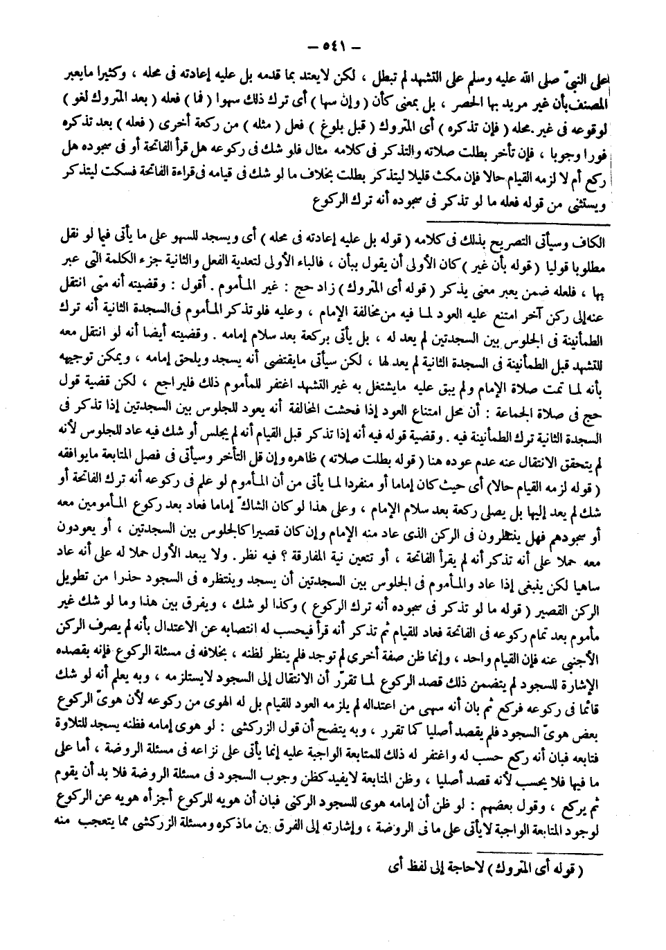 عَلَى النَّبِيِّ - صَلَّى اللَّهُ عَلَيْهِ وَسَلَّمَ - عَلَى التَّشَهُّدِ لَمْ تَبْطُلْ، لَكِنْ لَا يُعْتَدُّ بِمَا قَدَّمَهُ بَلْ عَلَيْهِ إعَادَتُهُ فِي مَحَلِّهِ، وَكَثِيرًا مَا يُعَبِّرُ الْمُصَنِّفُ بِأَنَّ غَيْرَ مُرِيدٍ بِهَا الْحَصْرَ، بَلْ بِمَعْنَى كَأَنْ (وَإِنْ سَهَا) أَيْ تَرَكَ ذَلِكَ سَهْوًا (فَمَا) فَعَلَهُ (بَعْدَ الْمَتْرُوكِ لَغْوٌ) لِوُقُوعِهِ فِي غَيْرِ مَحَلِّهِ (فَإِنْ تَذَكَّرَهُ) أَيْ الْمَتْرُوكَ (قَبْلَ بُلُوغِ) فِعْلٍ (مِثْلِهِ) مِنْ رَكْعَةٍ أُخْرَى (فَعَلَهُ) بَعْدَ تَذَكُّرِهِ فَوْرًا وُجُوبًا، فَإِنْ تَأَخَّرَ بَطَلَتْ صَلَاتُهُ وَالتَّذَكُّرُ فِي كَلَامِهِ مِثَالٌ فَلَوْ شَكَّ فِي رُكُوعِهِ هَلْ قَرَأَ الْفَاتِحَةَ أَوْ فِي سُجُودِهِ هَلْ رَكَعَ أَمْ لَا لَزِمَهُ الْقِيَامُ حَالًا فَإِنْ مَكَثَ قَلِيلًا لِيَتَذَكَّرَ بَطَلَتْ بِخِلَافِ مَا لَوْ شَكَّ فِي قِيَامِهِ فِي قِرَاءَةِ الْفَاتِحَةِ فَسَكَتَ لِيَتَذَكَّرَ وَيُسْتَثْنَى مِنْ قَوْلِهِ فَعَلَهُ مَا لَوْ تَذَكَّرَ فِي سُجُودِهِ أَنَّهُ تَرَكَ الرُّكُوعَ