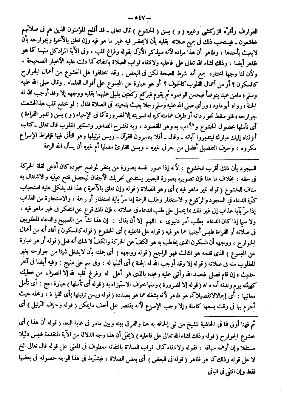 ـــــــــــــــــــــــــــــQثَمَّ فَهُنَا أَوْلَى فَمَا فِي الْحَاشِيَةِ لِلشَّيْخِ مِنْ نَفْيِ إلْحَاقِهِ بِهِ هُنَا، وَالْفَرْقُ بَيْنَهُ وَبَيْنَ مَا مَرَّ فِي غَايَةِ الْبُعْدِ (قَوْلُهُ: أَنَّ هَذَا) أَيْ خُشُوعَ الْجَوَارِحِ (قَوْلُهُ: وَذَلِكَ لِثَنَاءِ اللَّهِ تَعَالَى عَلَى فَاعِلِيهِ) لَا يَخْفَى أَنَّ هَذَا وَجْهُ الدَّلَالَةِ مِنْ الْآيَةِ الْمُتَقَدِّمَةِ فَلَيْسَ دَلِيلًا مُسْتَقِلًّا وَإِنْ أَوْهَمَهُ سِيَاقُهُ، فَقَوْلُهُ وَلِانْتِفَاءِ كَمَالِ ثَوَابِ الصَّلَاةِ بِانْتِفَائِهِ مَعْطُوفٌ فِي الْمَعْنَى عَلَى قَوْلِهِ قَالَ تَعَالَى إلَخْ لَا عَلَى قَوْلِهِ، وَذَلِكَ كَمَا هُوَ ظَاهِرٌ (قَوْلُهُ: فِي الْبَعْضِ) أَيْ بَعْضِ الصَّلَاةِ، فَيُشْتَرَطُ فِي هَذَا الْوَجْهِ حُصُولُهُ فِي بَعْضِهَا فَقَطْ وَإِنْ انْتَفَى فِي الْبَاقِي