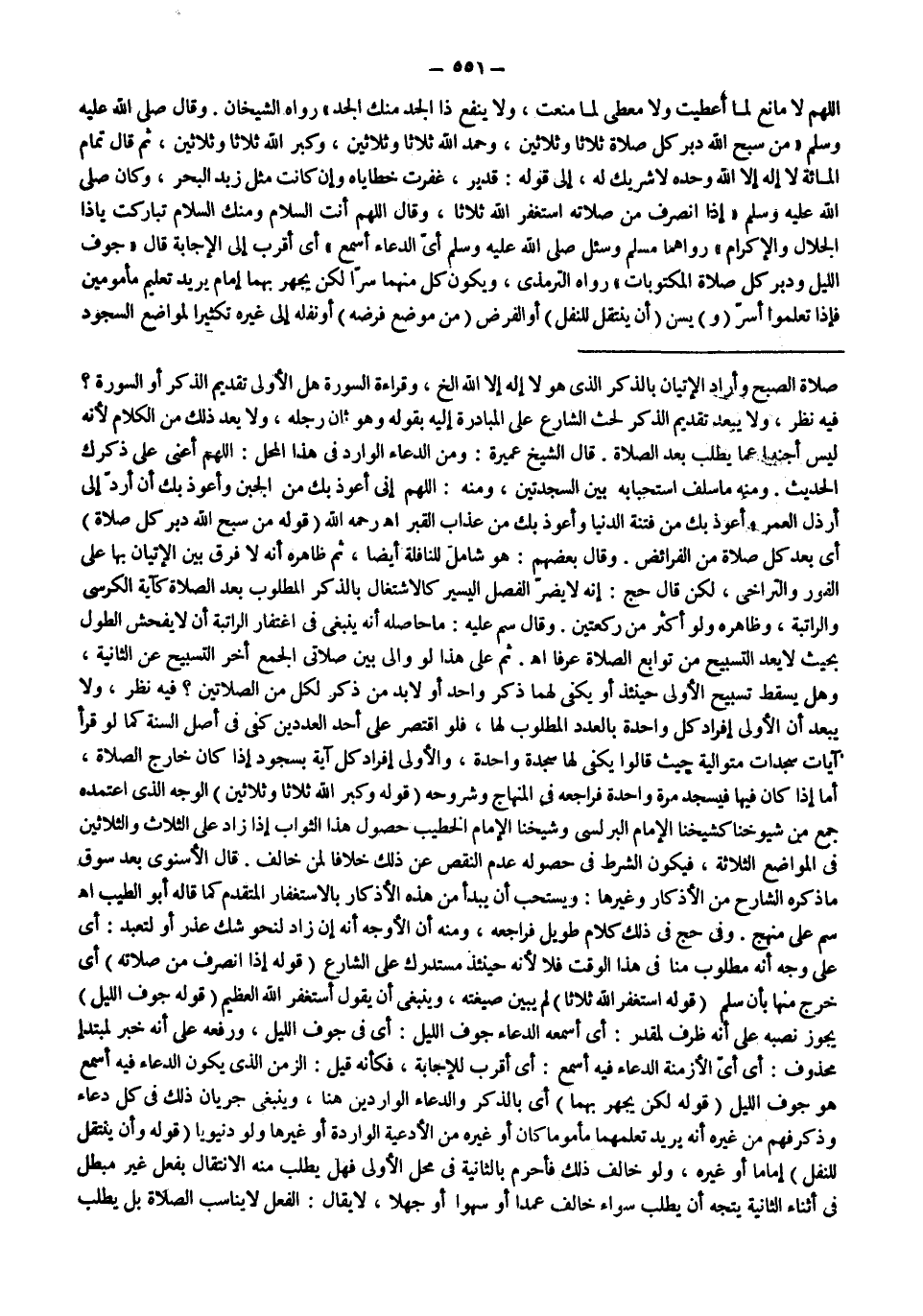 وَفِي حَجّ فِي ذَلِكَ كَلَامٌ طَوِيلٌ فَرَاجِعْهُ، وَمِنْهُ أَنَّ الْأَوْجَهَ أَنَّهُ إنْ زَادَ لِنَحْوِ شَكِّ عُذْرٍ أَوْ لِتَعَبُّدٍ: أَيْ عَلَى وَجْهِ أَنَّهُ مَطْلُوبٌ مِنَّا فِي هَذَا الْوَقْتِ فَلَا لِأَنَّهُ حِينَئِذٍ مُسْتَدْرَكٌ عَلَى الشَّارِعِ (قَوْلُهُ: إذَا انْصَرَفَ مِنْ صَلَاتِهِ) أَيْ خَرَجَ مِنْهَا بِأَنْ سَلَّمَ (قَوْلُهُ: اسْتَغْفِرْ اللَّهَ ثَلَاثًا) لَمْ يُبَيِّنْ صِيغَتَهُ، وَيَنْبَغِي أَنْ يَقُولَ أَسْتَغْفِرُ اللَّهَ الْعَظِيمَ (قَوْلُهُ: جَوْفُ اللَّيْلِ) يَجُوزُ نَصْبُهُ عَلَى أَنَّهُ ظَرْفٌ لِمُقَدَّرٍ: أَيْ أَسْمَعُهُ الدُّعَاءُ جَوْفَ اللَّيْلِ: أَيْ فِي جَوْفِ اللَّيْلِ، وَرَفْعُهُ عَلَى أَنَّهُ خَبَرٌ لِمُبْتَدَإٍ مَحْذُوفٍ: أَيْ أَيُّ الْأَزْمِنَةِ الدُّعَاءُ فِيهِ أَسْمَعُ: أَيْ أَقْرَبُ لِلْإِجَابَةِ، فَكَأَنَّهُ قِيلَ: الزَّمَنُ الَّذِي يَكُونُ الدُّعَاءُ فِيهِ أَسْمَعَ هُوَ جَوْفُ اللَّيْلِ (قَوْلُهُ: لَكِنْ يَجْهَرُ بِهِمَا) أَيْ بِالذِّكْرِ وَالدُّعَاءِ الْوَارِدَيْنِ هُنَا، وَيَنْبَغِي جَرَيَانُ ذَلِكَ فِي كُلِّ دُعَاءٍ وَذِكْرٍ فُهِمَ مِنْ غَيْرِهِ أَنَّهُ يُرِيدُ تَعَلُّمَهُمَا مَأْمُومًا كَانَ أَوْ غَيْرَهُ مِنْ الْأَدْعِيَةِ الْوَارِدَةِ أَوْ غَيْرِهَا وَلَوْ دُنْيَوِيًّا.