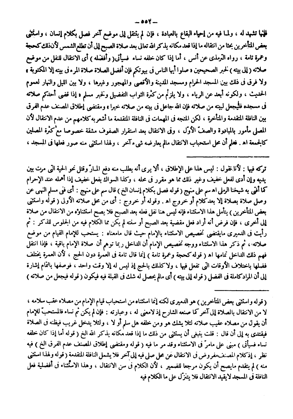 ـــــــــــــــــــــــــــــQقَوْلُهُ: وَاسْتَثْنَى بَعْضُ الْمُتَأَخِّرِينَ) هُوَ الدَّمِيرِيِّ لَكِنَّهُ إنَّمَا اسْتَثْنَاهُ مِنْ اسْتِحْبَابِ قِيَامِ الْإِمَامِ مِنْ مُصَلَّاهُ عَقِبَ سَلَامِهِ، لَا مِنْ الِانْتِقَالِ بِالصَّلَاةِ إلَى آخَرَ كَمَا صَنَعَهُ الشَّارِحُ إذْ لَا مَعْنَى لَهُ، وَعِبَارَتُهُ: فَإِنْ لَمْ يَكُنْ ثَمَّ نِسَاءٌ فَالْمُسْتَحَبُّ لِلْإِمَامِ أَنْ يَقُومَ مِنْ مُصَلَّاهُ عَقِيبَ صَلَاتِهِ لِئَلَّا يَشُكَّ هُوَ وَمَنْ خَلْفَهُ هَلْ سَلَّمَ أَوَّلًا، وَلِئَلَّا يَدْخُلَ غَرِيبٌ فَيَظُنَّهُ فِي الصَّلَاةِ فَيَقْتَدِيَ بِهِ إلَى أَنْ قَالَ: قُلْت يَنْبَغِي أَنْ يُسْتَثْنَى مِنْ ذَلِكَ مَا إذَا قَعَدَ مَكَانَهُ يَذْكُرُ اللَّهَ إلَخْ (قَوْلُهُ: أَمَّا إذَا كَانَ خَلْفَهُ نِسَاءٌ فَسَيَأْتِي) مَبْنِيٌّ عَلَى مَا مَرَّ فِي الِاسْتِثْنَاءِ وَقَدْ مَرَّ مَا فِيهِ (قَوْلُهُ: وَمُقْتَضِي إطْلَاقِ الْمُصَنِّفِ عَدَمَ الْفَرْقِ إلَخْ) فِيهِ نَظَرٌ، إذْ كَلَامُ الْمُصَنِّفِ مَفْرُوضٌ فِي الِانْتِقَالِ عَنْ مَحَلٍّ صَلَّى فِيهِ إلَى آخَرَ، فَلَا يَشْمَلُ النَّافِلَةَ الْمُتَقَدِّمَةَ (قَوْلُهُ: وَلِهَذَا اسْتَثْنَى مِنْهُ) لَمْ يَتَقَدَّمْ مَا يَصِحُّ أَنْ يَكُونَ مَرْجِعًا لِلضَّمِيرِ؛ لِأَنَّ الْكَلَامَ فِي سَنِّ الِانْتِقَالِ، وَهَذَا الِاسْتِثْنَاءُ فِي أَفْضَلِيَّةِ فِعْلِ النَّافِلَةِ فِي الْمَسْجِدِ لَا يُقَيِّدُ الِانْتِقَالَ، فَلَا يَتَنَزَّلُ عَلَى مَا الْكَلَامُ فِيهِ