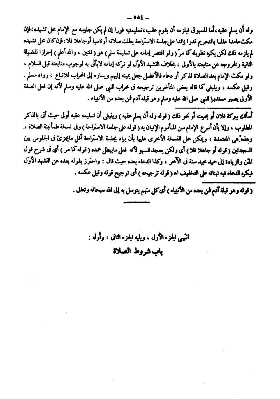 ـــــــــــــــــــــــــــــSأَسْأَلُك بِبَرَكَةِ فُلَانٍ أَوْ بِحُرْمَتِهِ أَوْ نَحْوِ ذَلِكَ (قَوْلُهُ وَلَهُ أَنْ يُسَلِّمَ عَقِبَهُ) وَيَنْبَغِي أَنَّ تَسْلِيمَهُ عَقِبَهُ أَوْلَى حَيْثُ أَتَى بِالذِّكْرِ الْمَطْلُوبِ، وَإِلَّا بِأَنْ أَسْرَعَ الْإِمَامُ سُنَّ لِلْمَأْمُومِ الْإِتْيَانُ بِهِ (قَوْلُهُ: عَلَى جِلْسَةِ الِاسْتِرَاحَةِ) وَفِي نُسْخَةٍ طُمَأْنِينَةُ الصَّلَاةِ، وَهَذِهِ هِيَ الْمُعْتَمَدَةُ، وَيُمْكِنُ حَمْلُ النُّسْخَةِ الْأُخْرَى عَلَيْهَا بِأَنْ يُرَادَ بِجِلْسَةِ الِاسْتِرَاحَةِ أَقَلُّ مَا يُجْزِئُ فِي الْجُلُوسِ بَيْنَ السَّجْدَتَيْنِ (قَوْلُهُ: أَوْ جَاهِلًا فَلَا) أَيْ وَلَكِنْ يَسْجُدُ لِلسَّهْوِ لِأَنَّهُ فَعَلَ مَا يُبْطِلُ عَمْدَهُ (قَوْلُهُ: كَمَا مَرَّ) أَيْ فِي شَرْحِ قَوْلِ الْمَتْنِ وَالزِّيَادَةُ إلَى حَمِيدٍ مَجِيدٍ سُنَّةٌ فِي الْآخِرِ، وَكَذَا الدُّعَاءُ بَعْدَهُ حَيْثُ قَالَ: وَاحْتَرَزَ بِقَوْلِهِ بَعْدَهُ عَنْ التَّشَهُّدِ الْأَوَّلِ فَيُكْرَهُ الدُّعَاءُ فِيهِ لِبِنَائِهِ عَلَى التَّخْفِيفِ اهـ (قَوْلُهُ: تَرْجِيحُهُ) أَيْ تَرْجِيحُ قَوْلِهِ وَقِيلَ عَكْسُهُ.