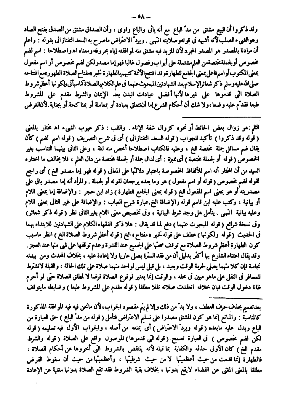 وَيَرُدُّ الِاعْتِرَاضَ مَا صَرَّحَ بِهِ السَّعْدُ التَّفْتَازَانِيُّ بِقَوْلِهِ: وَاعْلَمْ أَنَّ مُرَادَنَا بِالْمَصْدَرِ هُوَ الْمَصْدَرُ الْمُجَرَّدُ؛ لِأَنَّ الْمَزِيدَ فِيهِ مُشْتَقٌّ مِنْهُ لِمُوَافَقَتِهِ إيَّاهُ بِحُرُوفِهِ وَمَعْنَاهُ اهـ وَاصْطِلَاحًا: اسْمٌ لِضَمِّ مَخْصُوصٍ أَوَلِجُمْلَةٍ مُخْتَصَّةٍ مِنْ الْعِلْمِ مُشْتَمِلَةٍ عَلَى أَبْوَابٍ وَفُصُولٍ غَالِبًا فَهُوَ إمَّا مَصْدَرٌ لَكِنْ لِضَمٍّ مَخْصُوصٍ أَوْ اسْمِ مَفْعُولٍ بِمَعْنَى الْمَكْتُوبِ أَوْ اسْمِ فَاعِلٍ بِمَعْنَى الْجَامِعِ لِلطَّهَارَةِ وَقَدْ افْتَتَحَ الْأَئِمَّةُ كُتُبَهُمْ بِالطَّهَارَةِ لِخَبَرِ «مِفْتَاحُ الصَّلَاةِ الطَّهُورُ» مَعَ افْتِتَاحِهِ - صَلَّى اللَّهُ عَلَيْهِ وَسَلَّمَ - ذِكْرُ شَعَائِرِ الْإِسْلَامِ بَعْدَ الشَّهَادَتَيْنِ الْمَبْحُوثِ عَنْهُمَا فِي عِلْمِ الْكَلَامِ بِالصَّلَاةِ كَمَا سَيَأْتِي وَلِكَوْنِهَا أَعْظَمَ شُرُوطِ الصَّلَاةِ الَّتِي قَدَّمُوهَا عَلَى غَيْرِهَا؛ لِأَنَّهَا أَفْضَلُ عِبَادَاتِ الْبَدَنِ بَعْدَ الْإِيمَانِ وَالشَّرْطُ مُقَدَّمٌ عَلَى الْمَشْرُوطِ طَبْعًا فَقُدِّمَ عَلَيْهِ وَضْعًا، وَلَا شَكَّ أَنَّ أَحْكَامَ الشَّرْعِ إمَّا أَنْ تَتَعَلَّقَ بِعِبَادَةٍ أَوْ بِمُعَامَلَةٍ أَوْ بِمُنَاكَحَةٍ أَوْ بِجِنَايَةٍ؛ لِأَنَّ الْغَرَضَ