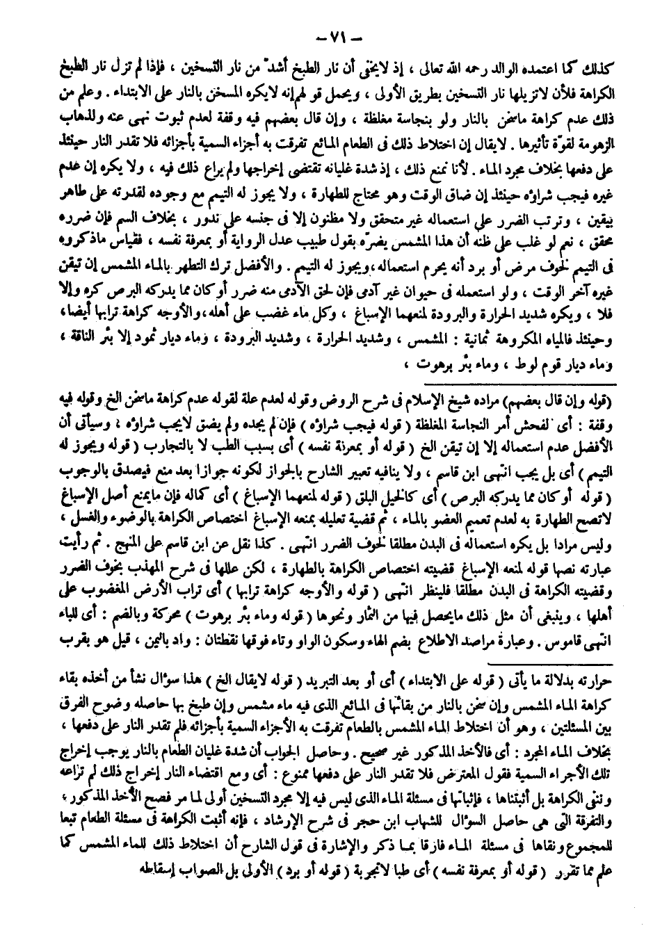 ـــــــــــــــــــــــــــــQحَرَارَتِهِ بِدَلَالَةِ مَا يَأْتِي (قَوْلُهُ: عَلَى الِابْتِدَاءِ) أَيْ أَوْ بَعْدَ التَّبْرِيدِ (قَوْلُهُ: لَا يُقَالُ إلَخْ) هَذَا سُؤَالٌ نَشَأَ مِنْ أَخْذِهِ بَقَاءَ كَرَاهَةِ الْمَاءِ الْمُشَمَّسِ وَإِنْ سُخِّنَ بِالنَّارِ مِنْ بَقَائِهَا فِي الْمَائِعِ الَّذِي فِيهِ مَاءٌ مُشَمَّسٌ وَإِنْ طُبِخَ بِهَا حَاصِلُهُ وُضُوحُ الْفَرْقِ بَيْنَ الْمَسْأَلَتَيْنِ، وَهُوَ أَنَّ اخْتِلَاطَ الْمَاءِ الْمُشَمَّسِ بِالطَّعَامِ تَفَرَّقَتْ بِهِ الْأَجْزَاءُ السُّمِّيَّةُ بِأَجْزَائِهِ فَلَمْ تَقْدِرْ النَّارُ عَلَى دَفْعِهَا، بِخِلَافِ الْمَاءِ الْمُجَرَّدِ: أَيْ فَالْأَخْذُ الْمَذْكُورُ غَيْرُ صَحِيحٍ.