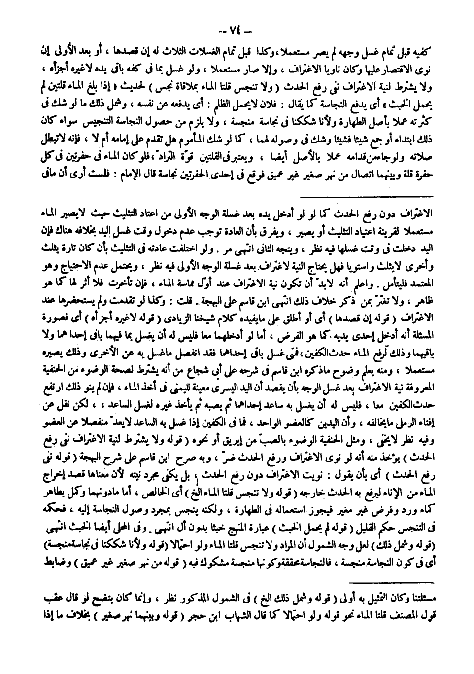 فَإِنْ لَمْ يَنْوِ ذَلِكَ ارْتَفَعَ حَدَثُ الْكَفَّيْنِ مَعًا، فَلَيْسَ لَهُ أَنْ يَغْسِلَ بِهِ سَاعِدَ إحْدَاهُمَا ثُمَّ يَصُبَّهُ ثُمَّ يَأْخُذَ غَيْرَهُ لِغَسْلِ السَّاعِدِ، لَكِنْ نُقِلَ عَنْ إفْتَاءِ الرَّمْلِيِّ مَا يُخَالِفُهُ، وَأَنَّ الْيَدَيْنِ كَالْعُضْوِ الْوَاحِدِ، فَمَا فِي الْكَفَّيْنِ إذَا غَسَلَ بِهِ السَّاعِدَ لَا يُعَدُّ مُنْفَصِلًا عَنْ الْعُضْوِ وَفِيهِ نَظَرٌ لَا يَخْفَى، وَمِثْلُ الْحَنَفِيَّةِ الْوُضُوءُ بِالصَّبِّ مِنْ إبْرِيقٍ أَوْ نَحْوِهِ (قَوْلُهُ: وَلَا يُشْتَرَطُ لِنِيَّةِ الِاغْتِرَافِ نَفْيُ رَفْعِ الْحَدَثِ) يُؤْخَذُ مِنْهُ أَنَّهُ لَوْ نَوَى الِاغْتِرَافَ وَرَفْعَ الْحَدَثِ ضَرَّ، وَبِهِ صَرَّحَ ابْنُ قَاسِمٍ عَلَى شَرْحِ الْبَهْجَةِ (قَوْلُهُ: نَفْيُ رَفْعِ الْحَدَثِ) أَيْ بِأَنْ يَقُولَ: نَوَيْت الِاغْتِرَافَ دُونَ رَفْعِ الْحَدَثِ، بَلْ يَكْفِي مُجَرَّدُ نِيَّتِهِ؛ لِأَنَّ مَعْنَاهَا قَصْدُ إخْرَاجِ الْمَاءِ مِنْ الْإِنَاءِ لِيُرْفَعَ بِهِ الْحَدَثُ خَارِجَهُ.
