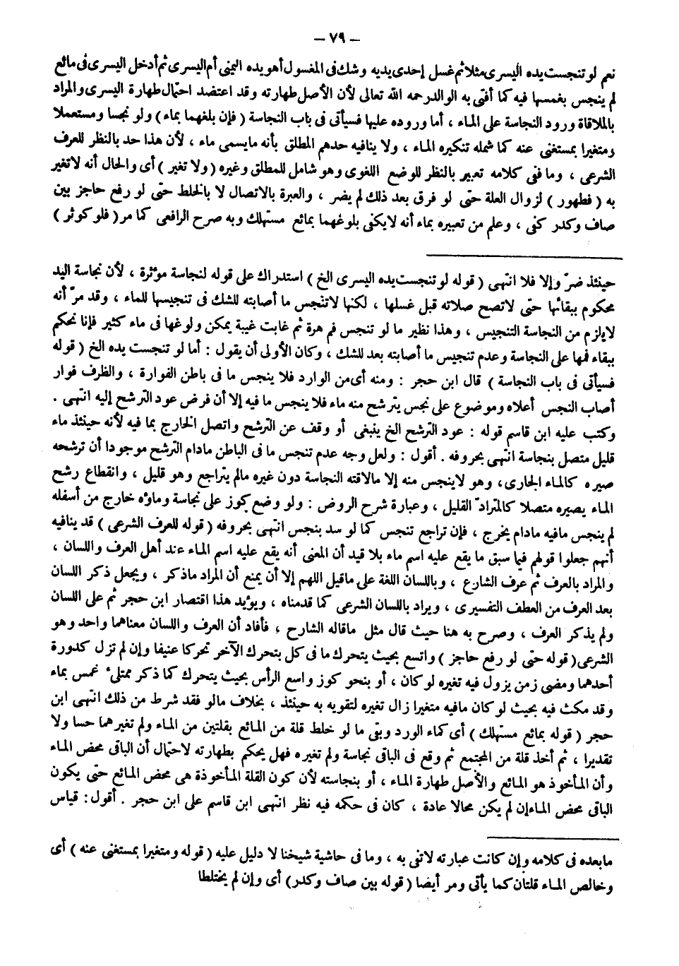 نَعَمْ لَوْ تَنَجَّسَتْ يَدُهُ الْيُسْرَى مَثَلًا ثُمَّ غَسَلَ إحْدَى يَدَيْهِ وَشَكَّ فِي الْمَغْسُولِ أَهُوَ يَدُهُ الْيُمْنَى أَمْ الْيُسْرَى ثُمَّ أَدْخَلَ الْيُسْرَى فِي مَائِعٍ لَمْ يَنْجُسْ بِغَمْسِهَا فِيهِ كَمَا أَفْتَى بِهِ الْوَالِدُ - رَحِمَهُ اللَّهُ تَعَالَى -؛ لِأَنَّ الْأَصْلَ طَهَارَتُهُ وَقَدْ اُعْتُضِدَ احْتِمَالُ طَهَارَةِ الْيُسْرَى وَالْمُرَادُ بِالْمُلَاقَاةِ وُرُودُ النَّجَاسَةِ عَلَى الْمَاءِ، أَمَّا وُرُودُهُ عَلَيْهَا فَسَيَأْتِي فِي بَابِ النَّجَاسَةِ (فَإِنْ بَلَغَهُمَا بِمَاءٍ) وَلَوْ نَجِسًا وَمُسْتَعْمَلًا وَمُتَغَيِّرًا بِمُسْتَغْنًى عَنْهُ كَمَا شَمِلَهُ تَنْكِيرُهُ الْمَاءَ، وَلَا يُنَافِيه حَدُّهُمْ الْمُطْلَقُ بِأَنَّهُ مَا يُسَمَّى مَاءً؛ لِأَنَّ هَذَا حَدٌّ بِالنَّظَرِ لِلْعُرْفِ الشَّرْعِيِّ، وَمَا فِي كَلَامِهِ تَعْبِيرٌ بِالنَّظَرِ لِلْوَضْعِ اللُّغَوِيِّ وَهُوَ شَامِلٌ لِلْمُطْلَقِ وَغَيْرِهِ (وَلَا تَغَيُّرَ) أَيْ وَالْحَالُ أَنَّهُ لَا تَغَيُّرَ بِهِ (فَطَهُورٌ) لِزَوَالِ الْعِلَّةِ حَتَّى لَوْ فَرَّقَ بَعْدَ ذَلِكَ لَمْ يَضُرَّ، وَالْعِبْرَةُ بِالِاتِّصَالِ لَا بِالْخَلْطِ حَتَّى لَوْ رُفِعَ حَاجِزٌ بَيْنَ صَافٍ وَكَدِرٍ كَفَى، وَعُلِمَ مِنْ تَعْبِيرِهِ بِمَاءٍ أَنَّهُ لَا يَكْفِي بُلُوغُهُمَا بِمَائِعٍ مُسْتَهْلَكٍ وَبِهِ صَرَّحَ الرَّافِعِيُّ كَمَا مَرَّ (فَلَوْ) (كُوثِرَ)