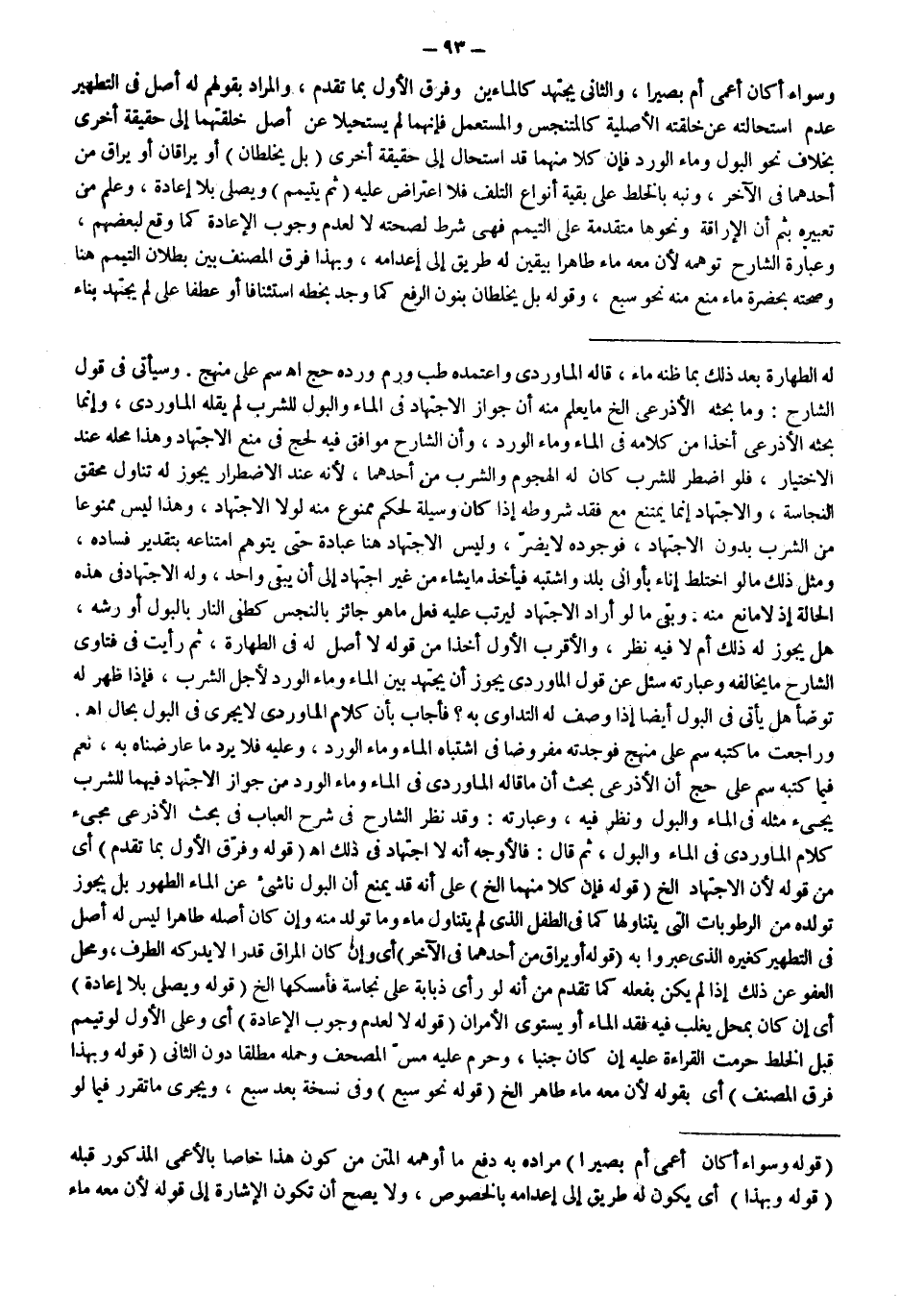وَرَاجَعْت مَا كَتَبَهُ سم عَلَى مَنْهَجٍ فَوَجَدْته مَفْرُوضًا فِي اشْتِبَاهِ الْمَاءِ وَمَاءِ الْوَرْدِ، وَعَلَيْهِ فَلَا يُرَدُّ مَا عَارَضْنَاهُ بِهِ، نَعَمْ فِيمَا كَتَبَهُ سم عَلَى حَجّ أَنَّ الْأَذْرَعِيَّ بَحَثَ أَنَّ مَا قَالَهُ الْمَاوَرْدِيُّ فِي الْمَاءِ وَمَاءِ الْوَرْدِ مِنْ جَوَازِ الِاجْتِهَادِ فِيهِمَا لِلشُّرْبِ يَجِيءُ مِثْلُهُ فِي الْمَاءِ وَالْبَوْلِ وَنَظَرَ فِيهِ، وَعِبَارَتُهُ: وَقَدْ نَظَرَ الشَّارِحُ فِي شَرْحِ الْعُبَابِ فِي بَحْثِ الْأَذْرَعِيِّ مَجِيءَ كَلَامِ الْمَاوَرْدِيِّ فِي الْمَاءِ وَالْبَوْلِ، ثُمَّ قَالَ: فَالْأَوْجَهُ أَنَّهُ لَا اجْتِهَادَ فِي ذَلِكَ اهـ (قَوْلُهُ وَفَرَّقَ الْأَوَّلَ بِمَا تَقَدَّمَ) أَيْ مِنْ قَوْلِهِ؛ لِأَنَّ الِاجْتِهَادَ إلَخْ (قَوْلُهُ: فَإِنَّ كُلًّا مِنْهُمَا إلَخْ) عَلَى أَنَّهُ قَدْ يَمْنَعُ أَنَّ الْبَوْلَ نَاشِئٌ عَنْ الْمَاءِ الطَّهُورِ بَلْ يَجُوزُ تَوَلُّدُهُ مِنْ الرُّطُوبَاتِ الَّتِي يَتَنَاوَلُهَا كَمَا فِي الطِّفْلِ الَّذِي لَمْ يَتَنَاوَلْ مَاءً وَمَا تَوَلَّدَ مِنْهُ وَإِنْ كَانَ أَصْلُهُ طَاهِرًا لَيْسَ لَهُ أَصْلٌ فِي التَّطْهِيرِ كَغَيْرِهِ الَّذِي عَبَّرُوا بِهِ.