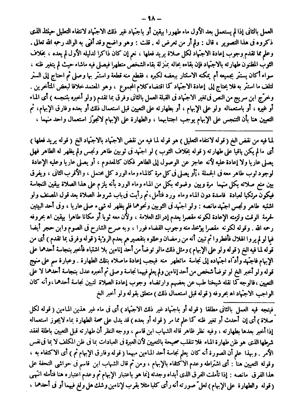 الْعَمَلِ بِالثَّانِي إذَا لَمْ يَسْتَعْمِلْ بَعْدَ الْأَوَّلِ مَاءً طَهُورًا بِيَقِينٍ أَوْ بِاجْتِهَادٍ غَيْرِ ذَلِكَ الِاجْتِهَادِ لِانْتِفَاءِ التَّعْلِيلِ حِينَئِذٍ الَّذِي ذَكَرُوهُ فِي هَذَا التَّصْوِيرِ، قَالَ: وَلَمْ أَرَ مَنْ تَعَرَّضَ لَهُ. قُلْت: وَهُوَ وَاضِحٌ وَقَدْ أَفْتَى بِهِ الْوَالِدُ - رَحِمَهُ اللَّهُ تَعَالَى -. وَعُلِمَ مِمَّا تَقَدَّمَ وُجُوبُ إعَادَةِ الِاجْتِهَادِ لِكُلِّ صَلَاةٍ يُرِيدُ فِعْلَهَا، نَعَمْ إنْ كَانَ ذَاكِرًا لِدَلِيلِهِ الْأَوَّلِ لَمْ يَعُدَّهُ، بِخِلَافِ الثَّوْبِ الْمَظْنُونِ طَهَارَتَهُ بِالِاجْتِهَادِ فَإِنَّ بَقَاءَهُ بِحَالِهِ بِمَنْزِلَةِ بَقَاءِ الشَّخْصِ مُتَطَهِّرًا فَيُصَلِّي فِيهِ مَا شَاءَ حَيْثُ لَمْ يَتَغَيَّرْ ظَنُّهُ، سَوَاءٌ أَكَانَ يَسْتَتِرُ بِجَمِيعِهِ أَمْ يُمْكِنُهُ الِاسْتِتَارُ بِبَعْضِهِ لِكِبَرِهِ، فَقَطَعَ مِنْهُ قِطْعَةً وَاسْتَتَرَ بِهَا وَصَلَّى ثُمَّ احْتَاجَ إلَى السَّتْرِ لَتَلِفَ مَا اسْتَتَرَ بِهِ فَلَا يَحْتَاجُ إلَى إعَادَةِ الِاجْتِهَادِ كَمَا اقْتَضَاهُ كَلَامُ الْمَجْمُوعِ، وَهُوَ الْمُعْتَمَدُ خِلَافًا لِبَعْضِ الْمُتَأَخِّرِينَ.