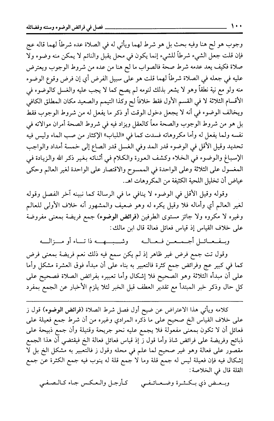وقوله وقيل الأقل في الوضوء لا ينافي ما في الرسالة كما نبينه آخر الفصل وقوله لغير العالم أي وأماله فلا وقيل يكره له وهو ضعيف والمشهور أنه خلاف الأولى للعالم وغيره لا مكروه ولا جائز مستوى الطرفين (فرائض الوضوء) جمع فريضة بمعنى مفروضة على خلاف القياس إذ قياس فعائل فعالة قال ابن مالك: