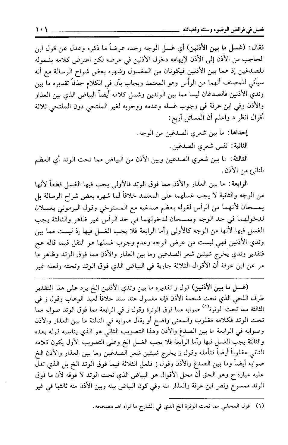 الرابعة: ما بين العذار والأذن مما فوق الوتد فالأولى يجب فيها الغسل قطعًا لأنها من الوجه والثانية لا يجب غسلهما على المعتمد خلافًا لما شهره بعض شراح الرسالة بل يمسحان لأنهما من الرأس لقوله بعظم صدغيه مع المسترخي وقول البرموني يغسلان لدخولهما في حد الوجه ويمسحان لدخولهما في حد الرأس غير ظاهر والثالثة يجب الغسل فيها لأنها من الوجه كالأولى وأما الرابعة فلا يجب الغسل فيها إذ ليست مما بين وتدي الأذنين فهي ليست من عرض الوجه وعدم وجوب غسلها هو النقل فيما قاله عج فتقدير وتدي يخرج شيئين شعر الصدغين وما بين العذار والأذن مما فوق الوتد وظاهر ما مر عن ابن عرفة أن الأقوال الثلاثة جارية في البياض الذي فوق الوتد وتحته ولعله غير