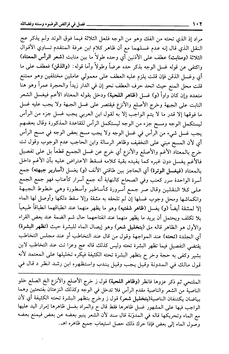 مراد إذ الذي تحته من الفك وهو من الوجه فلعل الثلاثة فيما فوق الوتد ولم يذكر عج النقل الذي قال إنه عدم غسلهما مع أن ظاهر كلام ابن عرفة المتقدم تساوي الأقوال الثلاثة (ومنابت) عطف على الأذنين أي وحده طولًا ما بين منابت (شعر الرأس المعتاد) واكتفى عن قوله غسل الوجه بذكر حده عرضًا وطولًا وأما قوله: (والذقن) فعطف على ما أي وغسل الذقن فإن قلت يلزم عليه العطف على معمولي عاملين مختلفين وهو ممتنع قلت محل المنع حيث اتحد حرف العطف نحو إن في الدار زيدًا والحجرة عمرًا وهو هنا متعدد وإن كان واوًا (و) غسل (ظاهر اللحية) ودخل بقوله المعتاد الأعم فيغسل الشعر النابت على الجبهة وخرج الأصلع والأنزع فيقتصر على غسل الجبهة ولا يجب عليه غسل ما فوقها إلا قدر ما لا يتم الواجب إلا به لقول ابن العربي يجب غسل جزء من الرأس ليستكمل الوجه ومسح جزء من الوجه ليستكمل الرأس للقاعدة المذكورة وقال بعضهم يجب غسل شيء من الرأس في غسل الوجه ولا يجب مسح بعض الوجه في مسح الرأس أي لأن المسح مبني على التخفيف وظاهر الرسالة وابن الحاجب عدم الوجوب وقول تت خرج بالمعتاد الأغم والأصلع والأنزع أي خرج عن غسل الجميع قطعًا بل على تفصيل فالأغم يغسل دون غيره كما يفيده بقية كلامه فسقط الاعتراض عليه بأن الأغم داخل بالمعتاد (فيغسل الوترة) أي الحاجز بين طاقتي الأنف (و) يغسل (أسارير جبهته) جمع أسرة الواحدة سرر كعنب وفي الصحاح كالنهاية أنه جمع أسرار كأعناب فهو جمع الجمع على كلا النقلين وقال صر جمع أسرورة كأساطير وأسطورة وهي خطوط الجبهة وانكماشها ومحل وجوب غسلها إن لم تلحقه به مشقة وإلا سقط دلكها وأوصل لها الماء إلا لمشقة أيضًا (و) يغسل (ظاهر شفتيه) وهو ما يظهر منهما عند انطباقهما انطباقًا طبيعيًّا بلا تكلف ويحتمل أن يريد ما يظهر منهما عند انفتاحهما حال ثم الضمة عند بعض القراء والأول هو الظاهر قاله مق (بتخليل شعر) وهو إيصال الماء للبشرة حيث (تظهر البشرة) أي الجلدة (تحته) عند المواجهة وقول من قال عند التخاطب أو عند مجلس التخاطب يقتضي التفصيل فيما تظهر البشرة تحته وليس كذلك قاله عج وعزا تت عند التخاطب لابن بشير وكفى به حجة وخر ح بتظهر البشرة تحته الكثيفة فيكره تخليلها على المعتمد لأنه قول مالك في المدونة وقيل يجب وقيل يندب واستظهره ابن رشد انظر د قال في