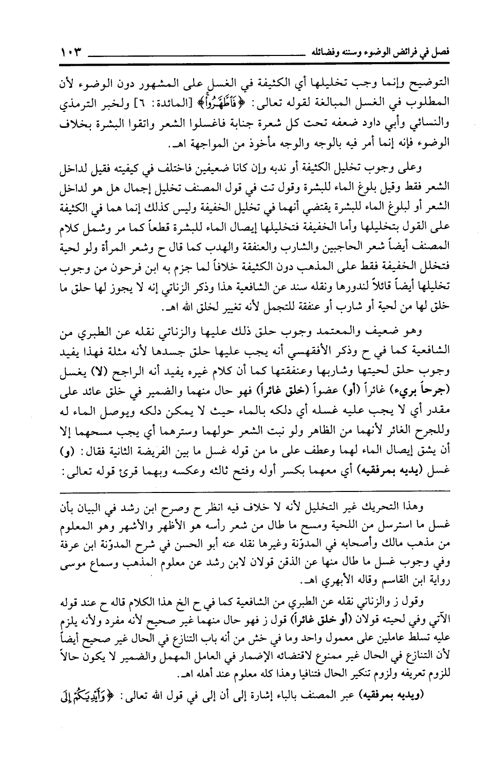وهو ضعيف والمعتمد وجوب حلق ذلك عليها والزناتي نقله عن الطبري من الشافعية كما في ح وذكر الأفقهسي أنه يجب عليها حلق جسدها لأنه مثلة فهذا يفيد وجوب حلق لحيتها وشاربها وعنفقتها كما أن كلام غيره يفيد أنه الراجح (لا) يغسل (جرحًا بريء) غائرًا (أو) عضوًا (خلق غائرًا) فهو حال منهما والضمير في خلق عائد على مقدر أي لا يجب عليه غسله أي دلكه بالماء حيث لا يمكن دلكه ويوصل الماء له وللجرح الغائر لأنهما من الظاهر ولو نبت الشعر حولهما وسترهما أي يجب مسحهما إلا أن يشق إيصال الماء لهما وعطف على ما من قوله غسل ما بين الفريضة الثانية فقال: (و) غسل (يديه بمرفقيه) أي معهما بكسر أوله وفتح ثالثه وعكسه وبهما قرئ قوله تعالى: