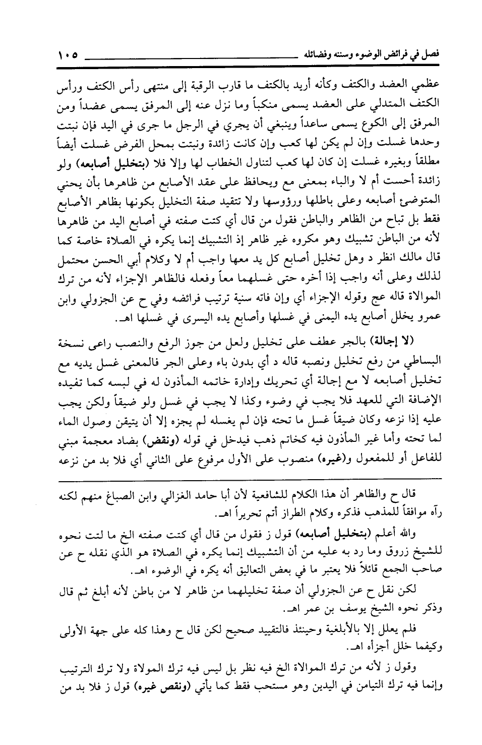 عظمي العضد والكتف وكأنه أريد بالكتف ما قارب الرقبة إلى منتهى رأس الكتف ورأس الكتف المتدلي على العضد يسمى منكبًا وما نزل عنه إلى المرفق يسمى عضدًا ومن المرفق إلى الكوع يسمى ساعدًا وينبغي أن يجري في الرجل ما جرى في اليد فإن نبتت وحدها غسلت وإن لم يكن لها كعب وإن كانت زائدة ونبتت بمحل الفرض غسلت أيضًا مطلقًا وبغيره غسلت إن كان لها كعب لتناول الخطاب لها وإلا فلا (بتخليل أصابعه) ولو زائدة أحست أم لا والباء بمعنى مع ويحافظ على عقد الأصابع من ظاهرها بأن يحني المتوضيء أصابعه وعلى باطلها ورؤوسها ولا تتقيد صفة التخليل بكونها بظاهر الأصابع فقط بل تباح من الظاهر والباطن فقول من قال أي كتت صفته في أصابع اليد من ظاهرها لأنه من الباطن تشبيك وهو مكروه غير ظاهر إذ التشبيك إنما يكره في الصلاة خاصة كما قال مالك انظر د وهل تخليل أصابع كل يد معها واجب أم لا وكلام أبي الحسن محتمل لذلك وعلى أنه واجب إذا أخره حتى غسلهما معًا وفعله فالظاهر الإجزاء لأنه من ترك الموالاة قاله عج وقوله الإجزاء أي وإن فاته سنية ترتيب فرائضه وفي ح عن الجزولي وابن عمرو يخلل أصابع يده اليمنى في غسلها وأصابع يده اليسرى في غسلها اهـ.