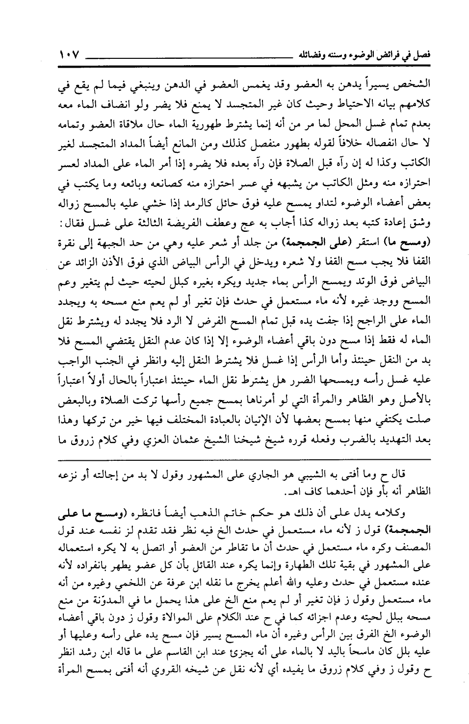 الشخص يسيرًا يدهن به العضو وقد يغمس العضو في الدهن وينبغي فيما لم يقع في كلامهم بيانه الاحتياط وحيث كان غير المتجسد لا يمنع فلا يضر ولو انضاف الماء معه بعدم تمام غسل المحل لما مر من أنه إنما يشترط طهورية الماء حال ملاقاة العضو وتمامه لا حال انفصاله خلافًا لقوله بطهور منفصل كذلك ومن المانع أيضًا المداد المتجسد لغير الكاتب وكذا له إن رآه قبل الصلاة فإن رآه بعده فلا يضره إذا أمر الماء على المداد لعسر احترازه منه ومثل الكاتب من يشبهه في عسر احترازه منه كصانعه وبائعه وما يكتب في بعض أعضاء الوضوء لتداو يمسح عليه فوق حائل كالرمد إذا خشي عليه بالمسح زواله وشق إعادة كتبه بعد زواله كذا أجاب به عج وعطف الفريضة الثالثة على غسل فقال: (ومسح ما) استقر (على الجمجمة) من جلد أو شعر عليه وهي من حد الجبهة إلى نقرة القفا فلا يجب مسح القفا ولا شعره ويدخل في الرأس البياض الذي فوق الأذن الزائد عن البياض فوق الوتد ويمسح الرأس بماء جديد ويكره بغيره كبلل لحيته حيث لم يتغير وعم المسح ووجد غيره لأنه ماء مستعمل في حدث فإن تغير أو لم يعم منع مسحه به ويجدد الماء على الراجح إذا جفت يده قبل تمام المسح الفرض لا الرد فلا يجدد له ويشترط نقل الماء له فقط إذا مسح دون باقي أعضاء الوضوء إلا إذا كان عدم النقل يقتضي المسح فلا بد من النقل حينئذ وأما الرأس إذا غسل فلا يشترط النقل إليه وانظر في الجنب الواجب عليه غسل رأسه ويمسحها الضرر هل يشترط نقل الماء حينئذ اعتبارًا بالحال أولًا اعتبارًا بالأصل وهو الظاهر والمرأة التي لو أمرناها بمسح جميع رأسها تركت الصلاة وبالبعض صلت يكتفي منها بمسح بعضها لأن الإتيان بالعبادة المختلف فيها خير من تركها وهذا بعد التهديد بالضرب وفعله قرره شيخ شيخنا الشيخ عثمان العزي وفي كلام زروق ما