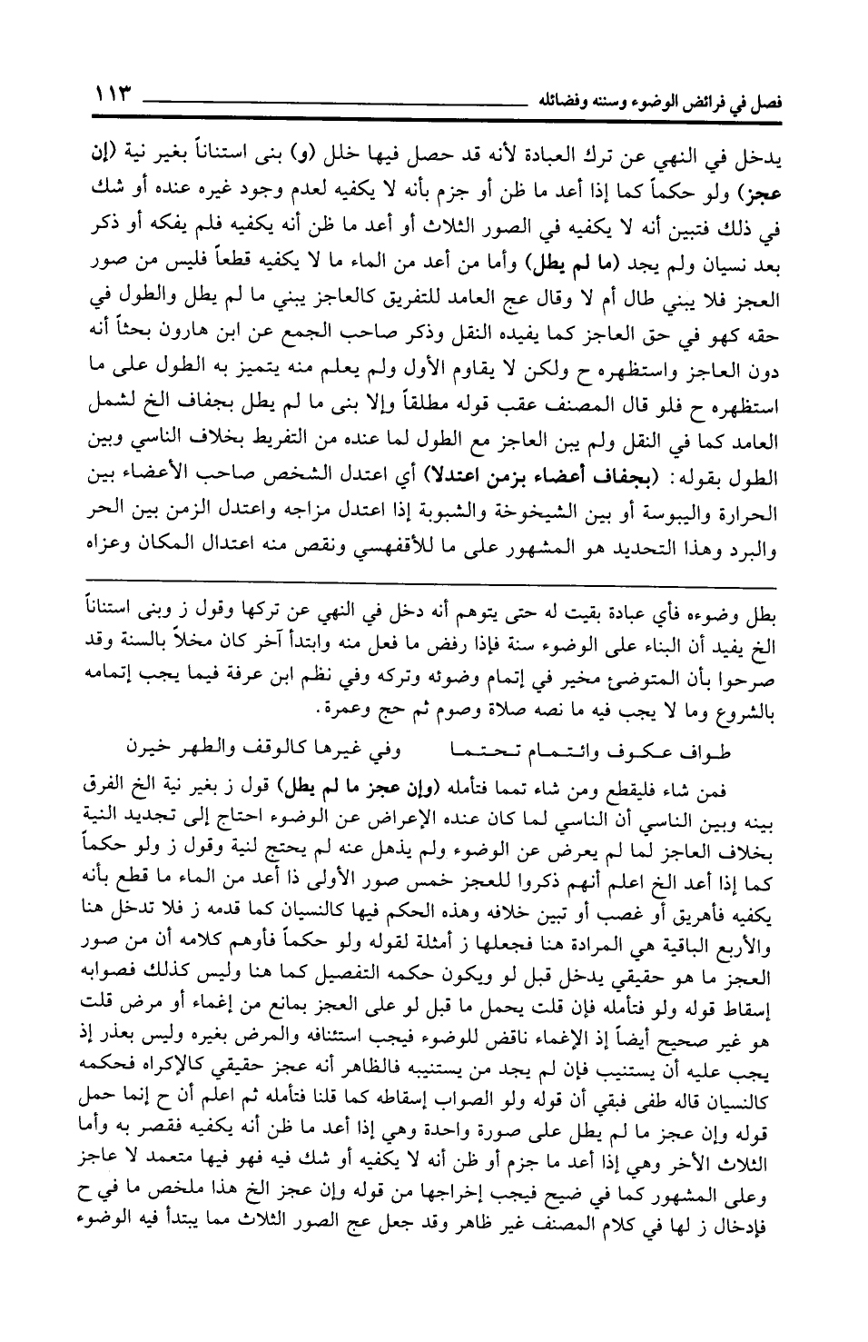 يدخل في النهي عن ترك العبادة لأنه قد حصل فيها خلل (و) بنى استنانًا بغير نية (إن عجز) ولو حكمًا كما إذا أعد ما ظن أو جزم بأنه لا يكفيه لعدم وجود غيره عنده أو شك في ذلك فتبين أنه لا يكفيه في الصور الثلاث أو أعد ما ظن أنه يكفيه فلم يفكه أو ذكر بعد نسيان ولم يجد (ما لم يطل) وأما من أعد من الماء ما لا يكفيه قطعًا فليس من صور العجز فلا يبني طال أم لا وقال عج العامد للتفريق كالعاجز يبني ما لم يطل والطول في حقه كهو في حق العاجز كما يفيده النقل وذكر صاحب الجمع عن ابن هارون بحثًا أنه دون العاجز واستظهره ح ولكن لا يقاوم الأول ولم يعلم منه يتميز به الطول على ما استظهره ح فلو قال المصنف عقب قوله مطلقًا وإلا بني ما لم يطل بجفاف الخ لشمل العامد كما في النقل ولم يبن العاجز مع الطول لما عنده من التفريط بخلاف الناسي وبين الطول بقوله: (بجفاف أعضاء بزمن اعتدلا) أي اعتدل الشخص صاحب الأعضاء بين الحرارة واليبوسة أو بين الشيخوخة والشبوبة إذا اعتدل مزاجه واعتدل الزمن بين الحر والبرد وهذا التحديد هو المشهور على ما للأقفهسي ونقص منه اعتدال المكان وعزاه