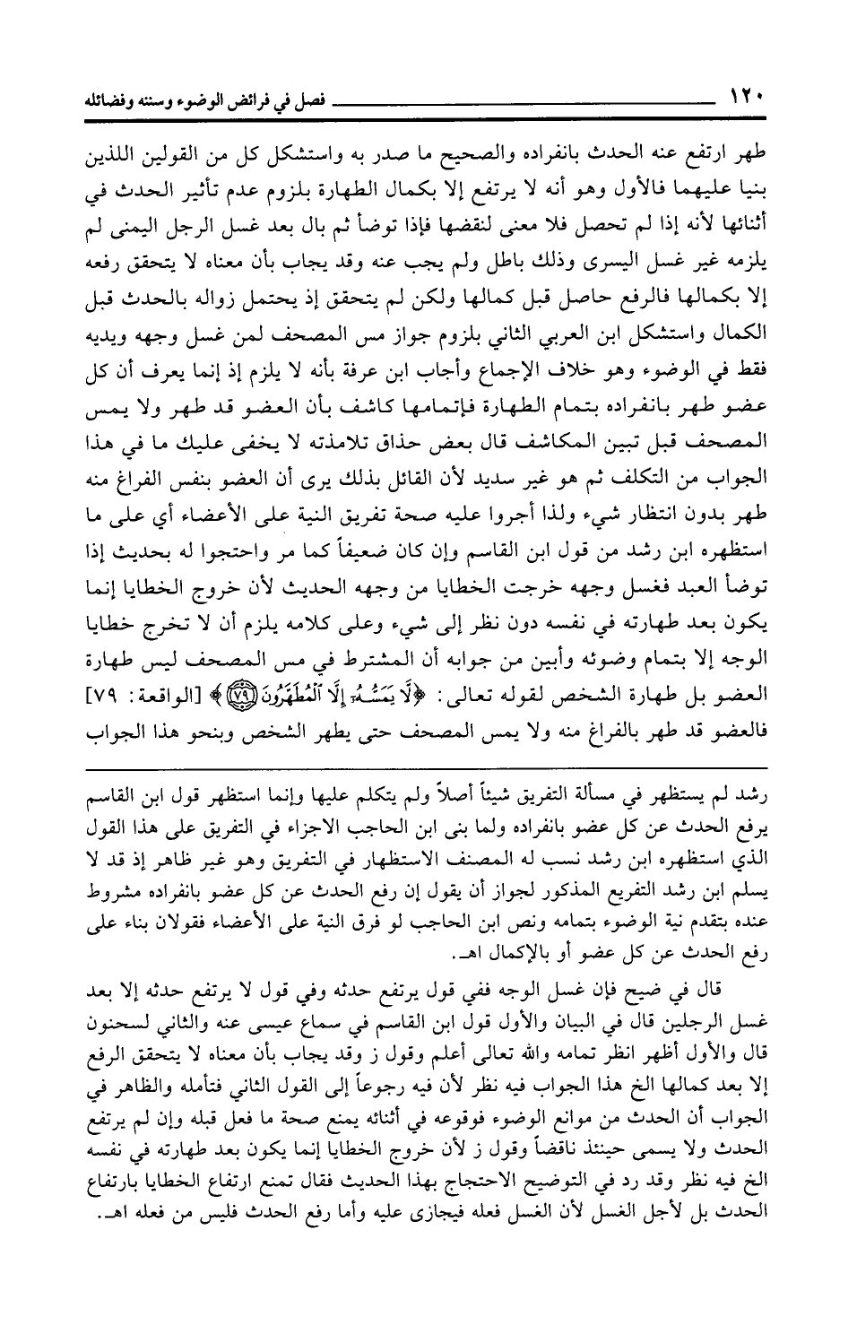 طهر ارتفع عنه الحدث بانفراده والصحيح ما صدر به واستشكل كل من القولين اللذين بنيا عليهما فالأول وهو أنه لا يرتفع إلا بكمال الطهارة بلزوم عدم تأثير الحدث في أثنائها لأنه إذا لم تحصل فلا معنى لنقضها فإذا توضأ ثم بال بعد غسل الرجل اليمنى لم يلزمه غير غسل اليسرى وذلك باطل ولم يجب عنه وقد يجاب بأن معناه لا يتحقق رفعه إلا بكمالها فالرفع حاصل قبل كمالها ولكن لم يتحقق إذ يحتمل زواله بالحدث قبل الكمال واستشكل ابن العربي الثاني بلزوم جواز مس المصحف لمن غسل وجهه ويديه فقط في الوضوء وهو خلاف الإجماع وأجاب ابن عرفة بأنه لا يلزم إذ إنما يعرف أن كل عضو طهر بانفراده بتمام الطهارة فإتمامها كاشف بأن العضو قد طهر ولا يمس المصحف قبل تبين المكاشف قال بعض حذاق تلامذته لا يخفى عليك ما في هذا الجواب من التكلف ثم هو غير سديد لأن القائل بذلك يرى أن العضو بنفس الفراغ منه طهر بدون انتظار شيء ولذا أجروا عليه صحة تفريق النية على الأعضاء أي على ما استظهره ابن رشد من قول ابن القاسم وإن كان ضعيفًا كما مر واحتجوا له بحديث إذا توضأ العبد فغسل وجهه خرجت الخطايا من وجهه الحديث لأن خروج الخطايا إنما يكون بعد طهارته في نفسه دون نظر إلى شيء وعلى كلامه يلزم أن لا تخرج خطايا الوجه إلا بتمام وضوئه وأبين من جوابه أن المشترط في مس المصحف ليس طهارة العضو بل طهارة الشخص لقوله تعالى: {لَا يَمَسُّهُ إِلَّا الْمُطَهَّرُونَ (79)} [الواقعة: 79] فالعضو قد طهر بالفراغ منه ولا يمس المصحف حتى يطهر الشخص وبنحو هذا الجواب