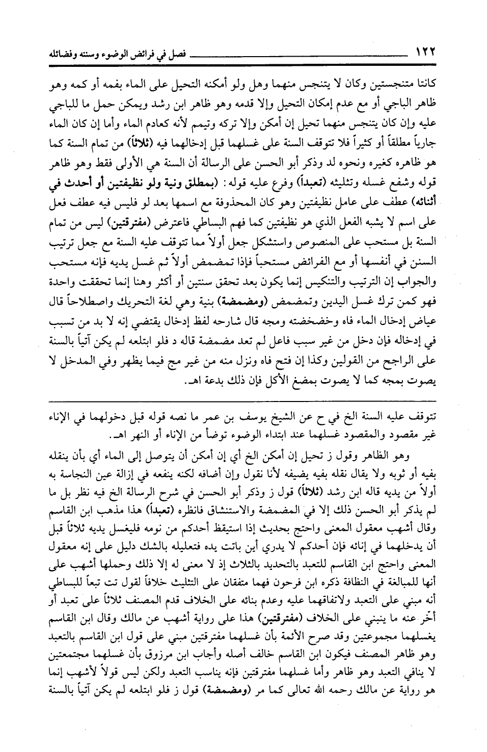 كانتا متنجستين وكان لا يتنجس منهما وهل ولو أمكنه التحيل على الماء بفمه أو كمه وهو ظاهر الباجي أو مع عدم إمكان التحيل وإلا قدمه وهو ظاهر ابن رشد ويمكن حمل ما للباجي عليه وإن كان يتنجس منهما تحيل إن أمكن وإلا تركه وتيمم لأنه كعادم الماء وأما إن كان الماء جاريًا مطلقًا أو كثيرًا فلا تتوقف السنة على غسلهما قبل إدخالهما فيه (ثلاثًا) من تمام السنة كما هو ظاهره كغيره ونحوه لد وذكر أبو الحسن على الرسالة أن السنة هي الأولى فقط وهو ظاهر قوله وشفع غسله وتثليثه (تعبدًا) وفرع عليه قوله: (بمطلق ونية ولو نظيفتين أو أحدث في أثنائه) عطف على عامل نظيفتين وهو كان المحذوفة مع اسمها بعد لو فليس فيه عطف فعل على اسم لا يشبه الفعل الذي هو نظيفتين كما فهم البساطي فاعترض (مفترقتين) ليس من تمام السنة بل مستحب على المنصوص واستشكل جعل أولًا مما تتوقف عليه السنة مع جعل ترتيب السنن في أنفسها أو مع الفرائض مستحبًّا فإذا تمضمض أولًا ثم غسل يديه فإنه مستحب والجواب إن الترتيب والتنكيس إنما يكون بعد تحقق سنتين أو أكثر وهنا إنما تحققت واحدة فهو كمن ترك غسل اليدين وتمضمض (ومضمضة) بنية وهي لغة التحريك واصطلاحًا قال عياض إدخال الماء فاه وخضخضته ومجه قال شارحه لفظ إدخال يقتضي إنه لا بد من تسبب في إدخاله فإن دخل من غير سبب فاعل لم تعد مضمضة قاله د فلو ابتلعه لم يكن آتيًا بالسنة على الراجح من القولين وكذا إن فتح فاه ونزل منه من غير مج فيما يظهر وفي المدخل لا يصوت بمجه كما لا يصوت بمضغ الأكل فإن ذلك بدعة اهـ.