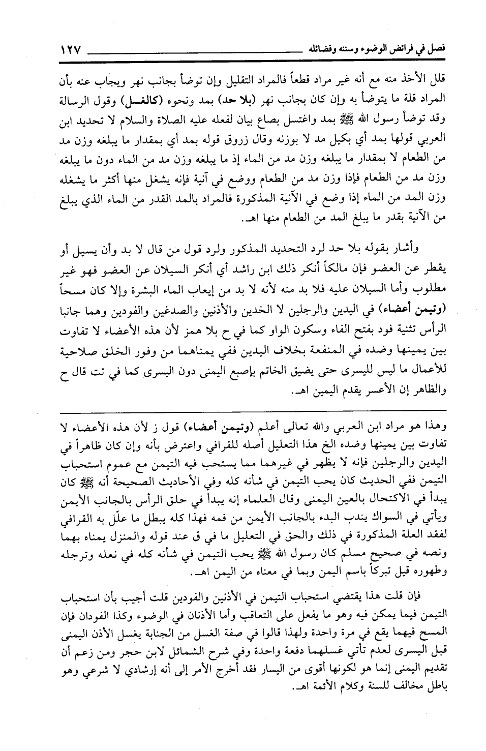 قلل الأخذ منه مع أنه غير مراد قطعًا فالمراد التقليل وإن توضأ بجانب نهر ويجاب عنه بأن المراد قلة ما يتوضأ به وإن كان بجانب نهر (بلا حد) بمد ونحوه (كالغسل) وقول الرسالة وقد توضأ رسول الله - صلى الله عليه وسلم - بمد واغتسل بصاع بيان لفعله عليه الصلاة والسلام لا تحديد ابن العربي قولها بمد أي بكيل مد لا بوزنه وقال زروق قوله بمد أي بمقدار ما يبلغه وزن مد من الطعام لا بمقدار ما يبلغه وزن مد من الماء إذ ما يبلغه وزن مد من الماء دون ما يبلغه وزن مد من الطعام فإذا وزن مد من الطعام ووضع في آنية فإنه يشغل منها أكثر ما يشغله وزن المد من الماء إذا وضع في الآنية المذكورة فالمراد بالمد القدر من الماء الذي يبلغ من الآنية بقدر ما يبلغ المد من الطعام منها اهـ.