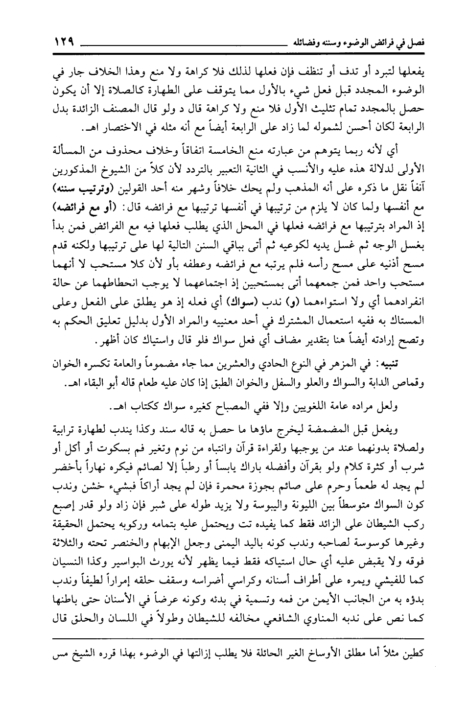 أي لأنه ربما يتوهم من عبارته منع الخامسة اتفاقًا وخلاف محذوف من المسألة الأولى لدلالة هذه عليه والأنسب في الثانية التعبير بالتردد لأن كلًّا من الشيوخ المذكورين آنفًا نقل ما ذكره على أنه المذهب ولم يحك خلافًا وشهر منه أحد القولين (وترتيب سننه) مع أنفسها ولما كان لا يلزم من ترتيبها في أنفسها ترتيبها مع فرائضه قال: (أو مع فرائضه) إذ المراد بترتيبها مع فرائضه فعلها في المحل الذي يطلب فعلها فيه مع الفرائض فمن بدأ بغسل الوجه ثم غسل يديه لكوعيه ثم أتى بباقي السنن التالية لها على ترتيبها ولكنه قدم مسح أذنيه على مسح رأسه فلم يرتبه مع فرائضه وعطفه بأو لأن كلا مستحب لا أنهما مستحب واحد فمن جمعهما أتى بمستحبين إذ اجتماعهما لا يوجب انحطاطهما عن حالة انفرادهما أي ولا استواءهما (و) ندب (سواك) أي فعله إذ هو يطلق على الفعل وعلى المستاك به ففيه استعمال المشترك في أحد معنييه والمراد الأول بدليل تعليق الحكم به وتصح إرادته أيضًا هنا بتقدير مضاف أي فعل سواك فلو قال واستياك كان أظهر.