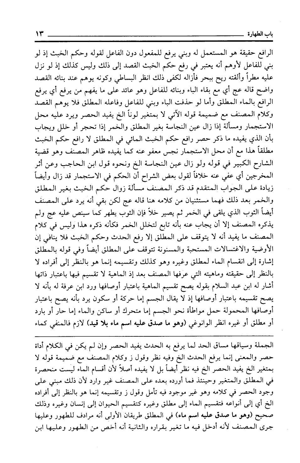 الرافع حقيقة هو المستعمل له وبني يرفع للمفعول دون الفاعل لقوله وحكم الخبث إذ لو بني للفاعل لأوهم أنه يعتبر في رفع حكم الخبث القصد إلى ذلك وليس كذلك إذ لو نزل عليه مطرًا وألقته ريح ببحر فأزاله لكفى ذلك انظر البساطي وكونه يوهم عند بنائه القصد واضح قاله عج أي مع بقاء الباء وبنائه للفاعل وهو عائد على ما يفهم من يرفع أي يرفع الرافع بالماء المطلق وأما لو حذفت الباء وبني للفاعل وفاعله المطلق فلا يوهم القصد وكلام المصنف مع ضميمة قوله الآتي لا بمتغير لونًا الخ يفيد الحصر ويرد عليه محل الاستجمار ومسألة إذا زال عين النجاسة بغير المطلق والخمر إذا تحجر أو خلل ويجاب بأن الذي يفيده ما ذكر حصر رافع حكم الخبث المائي في المطلق لا رافع حكم الخبث مطلقًا هذا مع أن محل الاستجمار نجس معفو عنه كما يفيده ظاهر المصنف وهو قضية الشارح الكبير في قوله ولو زال عين النجاسة الخ ونحوه قول ابن الحاجب وعن أثر المخرجين أي عفي عنه خلافًا لقول بعض الشراح أن الحكم في الاستجمار قد زال وأيضًا زيادة على الجواب المتقدم قد ذكر المصنف مسألة زوال حكم الخبث بغير المطلق والخمر بعد ذلك فهما مستثنيان من كلامه هنا قاله عج لكن بقي أنه يرد على المصنف أيضًا الثوب الذي يلقى في الخمر ثم يصير خلًا فإن الثوب يطهر كما سينص عليه عج ولم يذكره المصنف إلا أن يجاب عنه بأنه تابع لتخلل الخمر فكأنه ذكره هذا وليس في كلام المصنف ما يفيد أنه لا يتوقف على المطلق إلا رفع الحدث وحكم الخبث فلا ينافي إن الأوضية والاغتسالات المستحبة والمسنونة تتوقف على المطلق أيضًا وفي قوله بالمطلق إشارة إلى انقسام الماء لمطلق وغيره وهو كذلك وتقسيمه إنما هو بالنظر إلى أفراده لا بالنظر إلى حقيقته وماهيته التي عرفها المصنف بعد إذ الماهية لا تقسيم فيها باعتبار ذاتها أشار له ابن عبد السلام بقوله يصح تقسيم الماهية باعتبار أوصافها ورد ابن عرفة له بأنه لا يصح تقسيمه باعتبار أوصافها إذ لا يقال الجسم إما حركة أو سكون يرد بأنه يصح باعتبار أوصافها المحمولة حمل مواطأة نحو الجسم إما متحرك أو ساكن والماء إما حار أو بارد أو مطلق أو غيره انظر الوانوغي (وهو ما صدق عليه اسم ماء بلا قيد) لازم فالمنفي كماء
