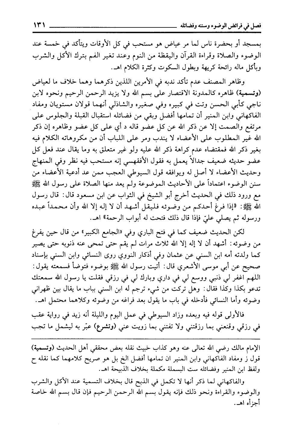 وظاهر المصنف عدم تأكد ندبه في الأمرين اللذين ذكرهما وهما خلاف ما لعياض (وتسمية) ظاهره كالمدونة الاقتصار على بسم الله ولا يزيد الرحمن الرحيم ونحوه لابن ناجي كأبي الحسن وتت في كبيره وفي صغيره والشاذلي أنهما قولان مستويان ومفاد الفاكهاني وابن المنير أن تمامها أفضل وبقي من فضائله استقبال القبلة والجلوس على مرتفع والصمت إلا عن ذكر الله عن كل عضو قاله د أي على كل عضو وظاهره إن ذكر الله غير المطلوب على الأعضاء لا يندب ومر على اللباب أن من مكروهاته الكلام فيه بغير ذكر الله فمقتضاه عدم كراهة ذكر الله عليه ولو غير متعلق به وما يقال عند فعل كل عضو حديثه ضعيف جدالًا يعمل به فقول الأفقهسي إنه مستحب فيه نظر وفي المنهاج وحديث الأعضاء لا أصل له ويوافقه قول السيوطي العجب ممن عد أدعية الأعضاء من سنن الوضوء اعتمادًا على الأحاديث الموضوعة ولم يعد منها الصلاة على رسول الله - صلى الله عليه وسلم - مع ورود ذلك في الحديث أخرج أبو الشيخ في الثواب عن ابن مسعود قال: قال رسول الله - صلى الله عليه وسلم -: "إذا فرغ أحدكم من وضوئه فليقل أشهد أن لا إله إلا الله وأن محمدًا عبده ورسوله ثم يصلي عليّ فإذا قال ذلك فتحت له أبواب الرحمة" اهـ.