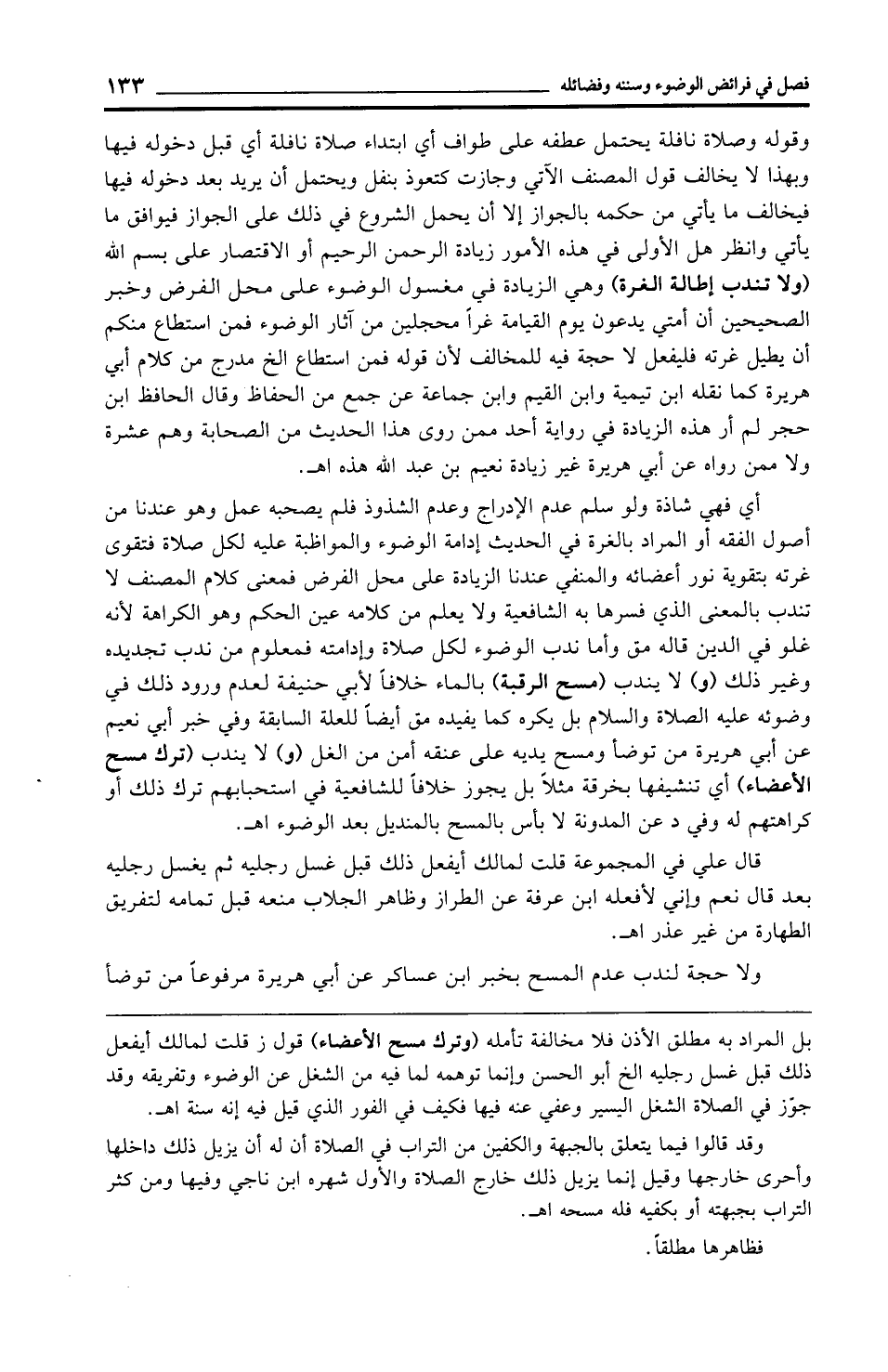 أي فهي شاذة ولو سلم عدم الإدراج وعدم الشذوذ فلم يصحبه عمل وهو عندنا من أصول الفقه أو المراد بالغرة في الحديث إدامة الوضوء والمواظبة عليه لكل صلاة فتقوى غرته بتقوية نور أعضائه والمنفي عندنا الزيادة على محل الفرض فمعنى كلام المصنف لا تندب بالمعنى الذي فسرها به الشافعية ولا يعلم من كلامه عين الحكم وهو الكراهة لأنه غلو في الدين قاله مق وأما ندب الوضوء لكل صلاة وإدامته فمعلوم من ندب تجديده وغير ذلك (و) لا يندب (مسح الرقبة) بالماء خلافًا لأبي حنيفة لعدم ورود ذلك في وضوئه عليه الصلاة والسلام بل يكره كما يفيده من أيضًا للعلة السابقة وفي خبر أبي نعيم عن أبي هريرة من توضأ ومسح يديه على عنقه أمن من الغل (و) لا يندب (ترك مسح الأعضاء) أي تنشيفها بخرقة مثلًا بل يجوز خلافًا للشافعية في استحبابهم ترك ذلك أو كراهتهم له وفي د عن المدونة لا بأس بالمسح بالمنديل بعد الوضوء اهـ.