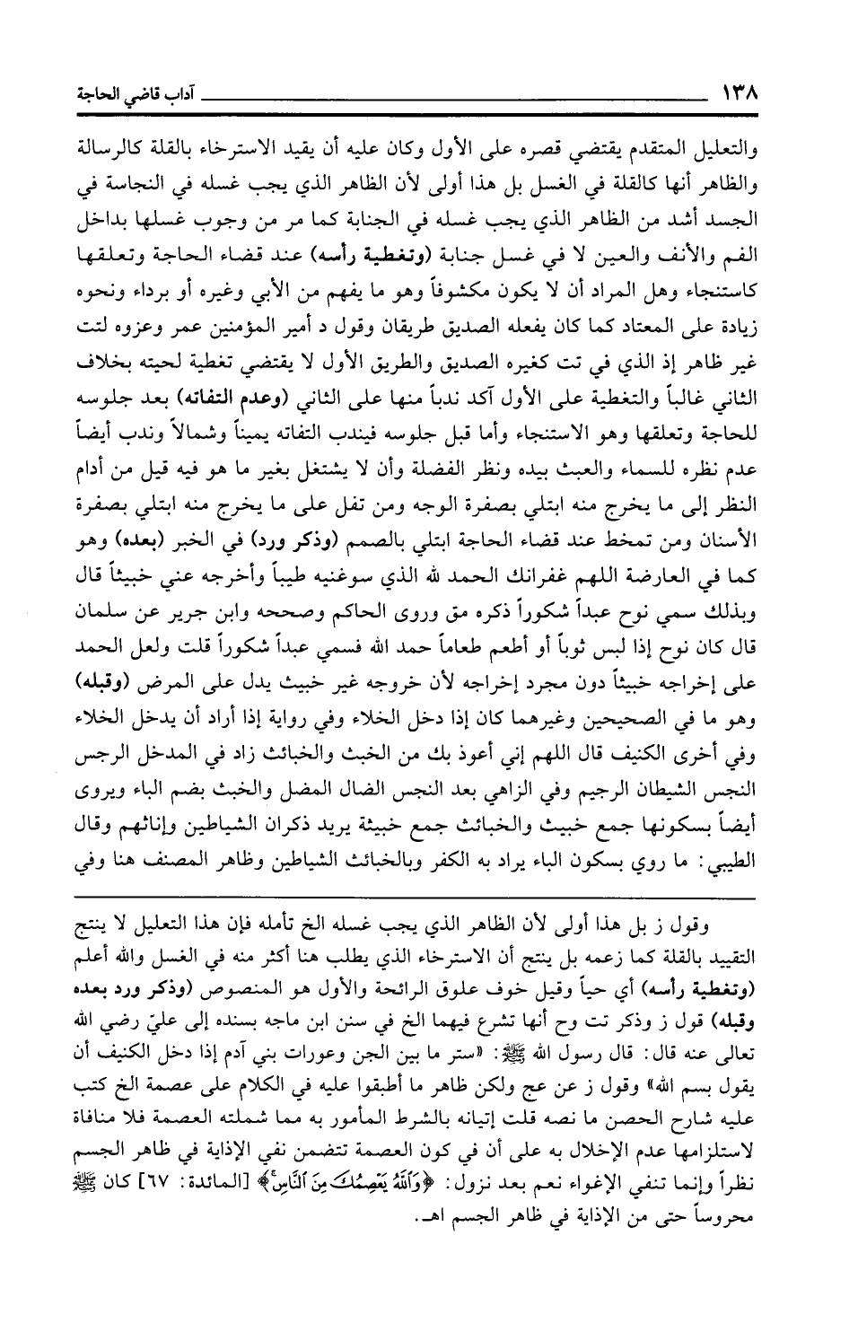 والتعليل المتقدم يقتضي قصره على الأول وكان عليه أن يقيد الاسترخاء بالقلة كالرسالة والظاهر أنها كالقلة في الغسل بل هذا أولى لأن الظاهر الذي يجب غسله في النجاسة في الجسد أشد من الظاهر الذي يجب غسله في الجنابة كما مر من وجوب غسلها بداخل الفم والأنف والعين لا في غسل جنابة (وتغطية رأسه) عند قضاء الحاجة وتعلقها كاستنجاء وهل المراد أن لا يكون مكشوفًا وهو ما يفهم من الأبي وغيره أو برداء ونحوه زيادة على المعتاد كما كان يفعله الصديق طريقان وقول د أمير المؤمنين عمر وعزوه لتت غير ظاهر إذ الذي في تت كغيره الصديق والطريق الأول لا يقتضي تغطية لحيته بخلاف الثاني غالبًا والتغطية على الأول آكد ندبًا منها على الثاني (وعدم التفاته) بعد جلوسه للحاجة وتعلقها وهو الاستنجاء وأما قبل جلوسه فيندب التفاته يمينًا وشمالًا وندب أيضًا عدم نظره للسماء والعبث بيده ونظر الفضلة وأن لا يشتغل بغير ما هو فيه قيل من أدام النظر إلى ما يخرج منه ابتلي بصفرة الوجه ومن تفل على ما يخرج منه ابتلي بصفرة الأسنان ومن تمخط عند قضاء الحاجة ابتلي بالصمم (وذكر ورد) في الخبر (بعده) وهو كما في العارضة اللهم غفرانك الحمد لله الذي سوغنيه طيبًا وأخرجه عني خبيثًا قال وبذلك سمي نوح عبدًا شكورًا ذكره من وروى الحاكم وصححه وابن جرير عن سلمان قال كان نوح إذا لبس ثوبًا أو أطعم طعامًا حمد الله فسمي عبدًا شكورًا قلت ولعل الحمد على إخراجه خبيثًا دون مجرد إخراجه لأن خروجه غير خبيث يدل على المرض (وقبله) وهو ما في الصحيحين وغيرهما كان إذا دخل الخلاء وفي رواية إذا أراد أن يدخل الخلاء وفي أخرى الكنيف قال اللهم إني أعوذ بك من الخبث والخبائث زاد في المدخل الرجس النجس الشيطان الرجيم وفي الزاهي بعد النجس الضال المضل والخبث بضم الباء ويروى أيضًا بسكونها جمع خبيث والخبائث جمع خبيثة يريد ذكران الشياطين وإناثهم وقال الطيبي: ما روي بسكون الباء يراد به الكفر وبالخبائث الشياطين وظاهر المصنف هنا وفي