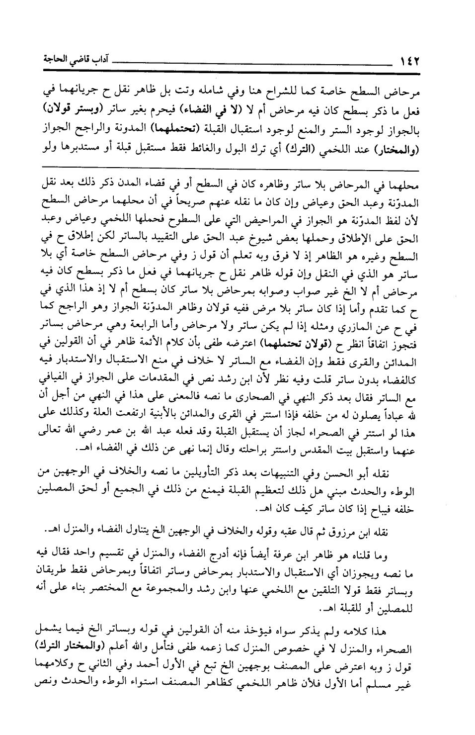 مرحاض السطح خاصة كما للشراح هنا وفي شامله وقت بل ظاهر نقل ح جريانهما في فعل ما ذكر بسطح كان فيه مرحاض أم لا (لا في الفضاء) فيحرم بغير ساتر (وبستر قولان) بالجواز لوجود الستر والمنع لوجود استقبال القبلة (تحتملهما) المدونة والراجح الجواز (والمختار) عند اللخمي (الترك) أي ترك البول والغائط فقط مستقبل قبلة أو مستدبرها ولو