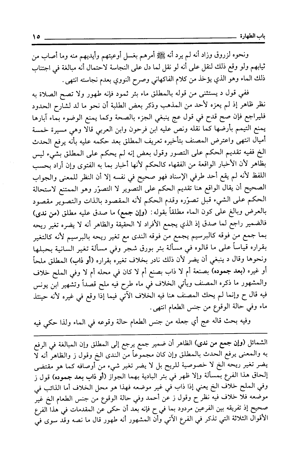 الشمائل (وإن جمع من ندى) الظاهر أن ضمير جمع يرجع إلى المطلق وإن المبالغة في الرفع به والمعنى يرفع الحدث بالمطلق وإن كان مجموعًا من الندى الخ وقول ز والظاهر أنه لا يضر تغير ريحه الخ لا خصوصية للريح بل لا يضر تغير شيء من أوصافه كما هو مقتضى إلحاق هذا الفرع بمسألة وإلا ظهر في بئر البادية بهما الجواز (أو ذاب بعد جموده) قول ز وفي الملح خلاف الخ يعني إذا ذاب في غير موضعه فهذا هو محل الخلاف أما الذائب في موضعه فلا خلاف فيه نظر ح وقول ز عن أحمد وفي حالة الوقوع من جنس الطعام الخ غير صحيح إذ تفريقه بين الفرعين مردود بما في ح فإنه بعد أن حكى عن المقدمات في هذا الفرع الأقوال الثلاثة التي تذكر في الفرع الآتي وأن المشهور أنه طهور قال ما نصه وقد سوى في