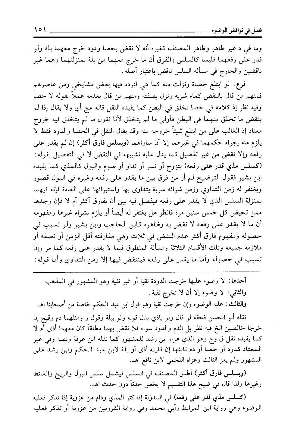 فرع: لو ابتلع حصاة ونزلت منه كما هي فتردد فيها بعض مشايخي ومن عاصرهم فمنهم من قال بالنقض كماء شربه ونزل بصفته ومنهم من قال بعدمه عملًا بقوله لا حصا وفيه نظر إذ كلامه في حصا تخلق في البطن كما يفيده النقل قاله عج أي ولا يقال إذا لم ينقض ما تخلق منهما في البطن فأولى ما لم يتخلق لأنا نقول ما لم يتخلق فيه خروج معتاد إذ الغالب على من ابتلع شيئًا خروجه منه وقد يقال النقل في الحصا والدود فقط لا يلزم منه إجراء حكمهما في غيرهما إلا أن ساواهما (وبسلس فارق أكثر) إن لم يقدر على رفعه وإلا نقض من غير تفصيل كما يدل عليه تشبيهه في النقض لا في التفصيل بقوله: (كسلس مذي قدر على رفعه) بتزوج أو تسر أو تداو أو صوم والبول كالمذي كما يفيده ابن بشير فقول التوضيح لم أر من فرق بين ما يقدر على رفعه وغيره في البول قصور ويغتفر له زمن التداوي وزمن شرائه سرية يتداوى بها واستبرائها على العادة فإنه فيهما بمنزلة السلس الذي لا يقدر على رفعه فيفصل فيه بين أن يفارق أكثر أم لا فإن وجدها ممن تحيض كل خمس سنين مرة فانظر هل يغتفر له أيضًا أو يلزم بشراء غيرها ومفهومه أن ما لا يقدر على رفعه لا نقض به وظاهره كابن الحاجب وابن بشير ولو تسبب في حصوله ومفهوم فارق أكثر عدم النقض في ثلاث وهي مفارقته أقل الزمن أو نصفه أو ملازمه جميعه وتلك الأقسام الثلاثة ومسألة المنطوق فيما لا يقدر على رفعه كما مر وإن تسبب في حصوله وأما ما يقدر على رفعه فينتقض فيها إلا زمن التداوي وأما قوله: